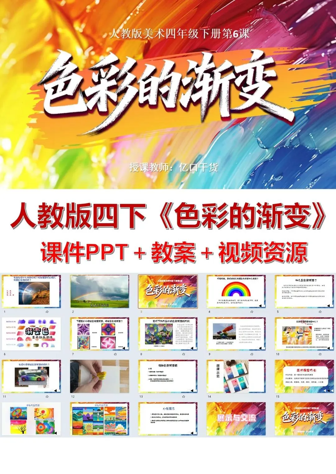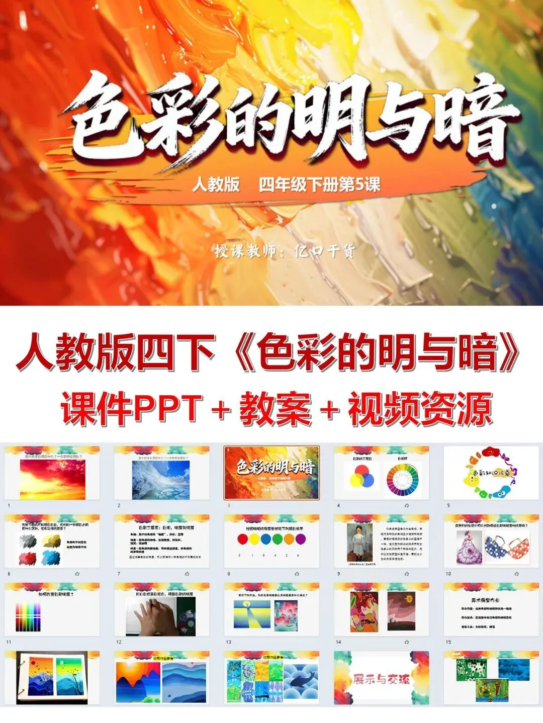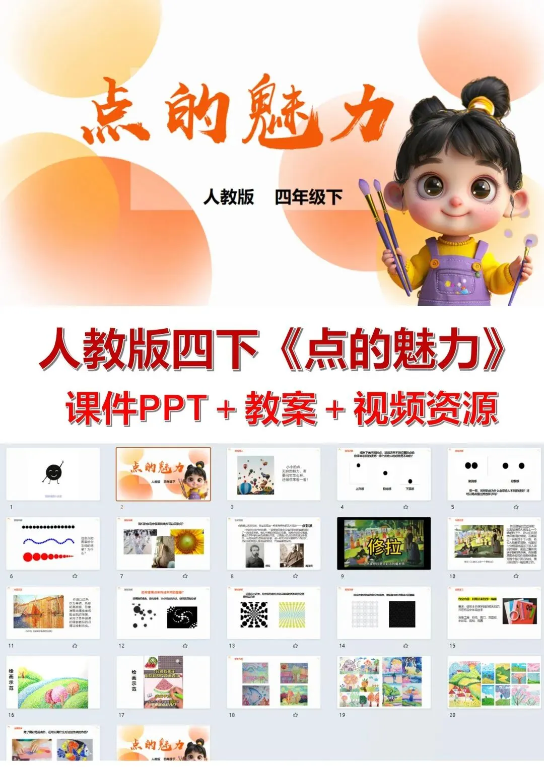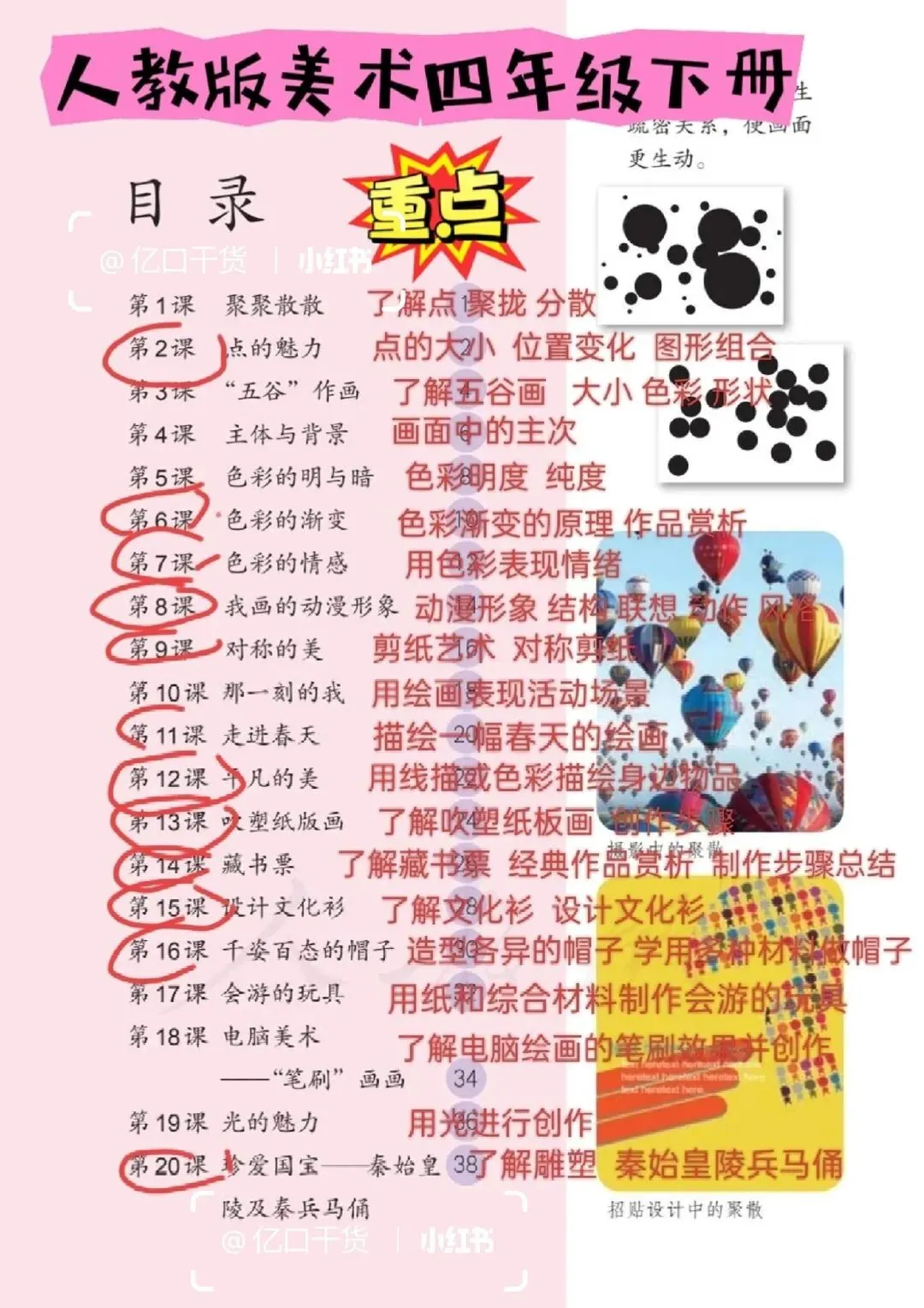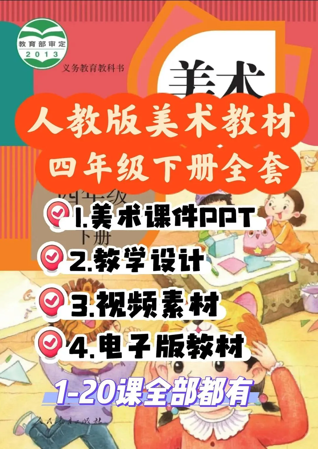 人教版美术四年级下册全套课件资源来了! 图1是四下教材的目录,标记每一节课的重点内容和圈记了适合上公开课的课程[飞吻R][飞吻R][飞吻R] [星R]全套课件资源丰富,包含以下资源 [一R]美术课件PPT [二R]教学设计 [三R]视频素材 [四R]电子版教材 [星R]人教版四下美术共1-20课 第1课 聚聚散散 第2课 点的魅力 第3课 "五谷"作画 第4课 主体与背景 第5课 色彩的明与暗 第6课 色彩的渐变 第7课 色彩的情感 第8课 我画的动漫形象 第9课对称的美 第10课 那一刻的我 第11课走进春天 第12课 平凡的美 第13课 吹塑纸版画 第14课藏书票 第15课 设计文化衫 第16课 千姿百态的帽子 第17课 会游的玩具 第18课 电脑美术"笔刷"画画 第19课 光的魅力 第20课珍爱国宝秦始皇陵及秦兵马俑本文内容来源于网络 版权归原作者所有、如有侵权,联系删除