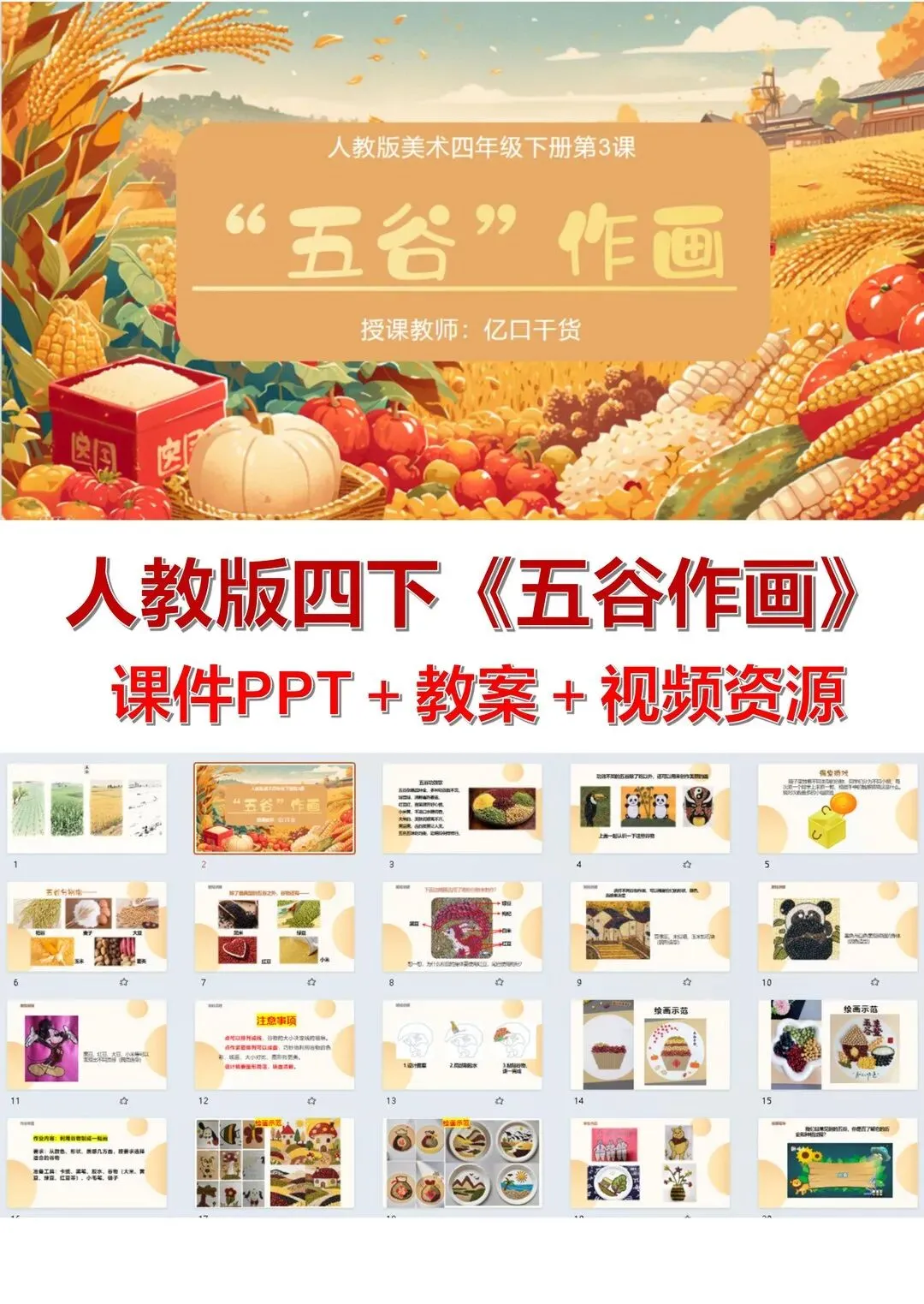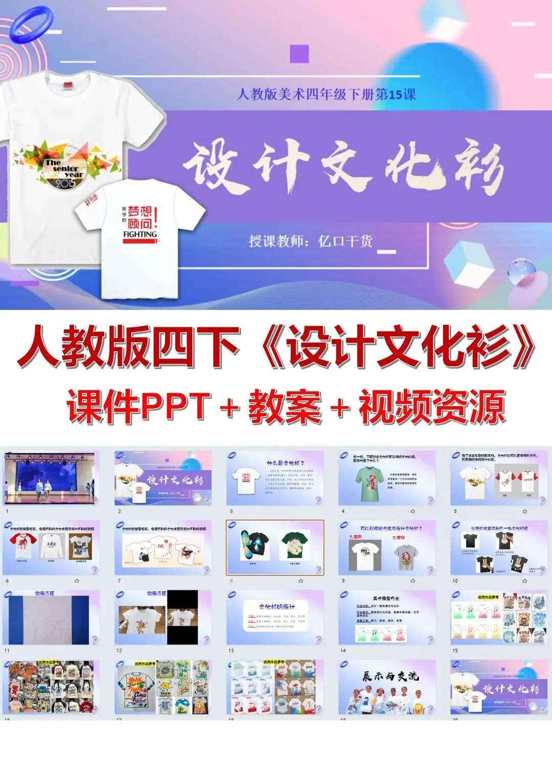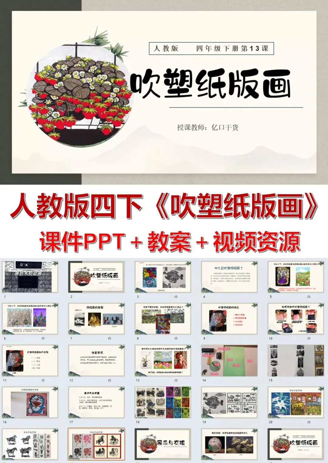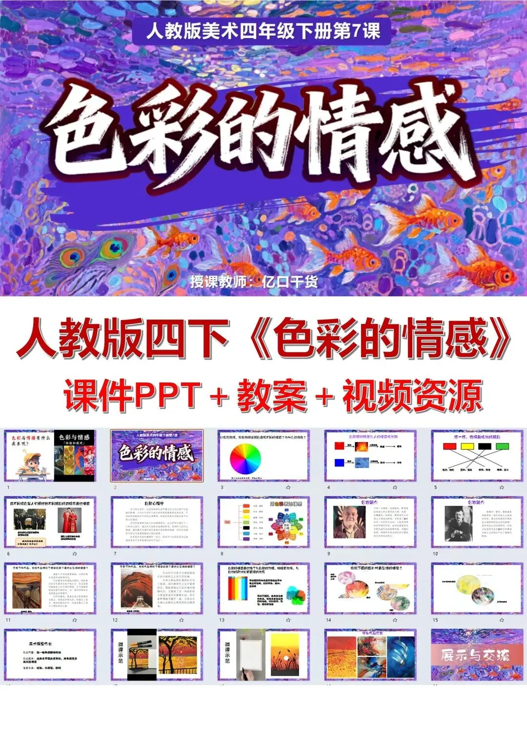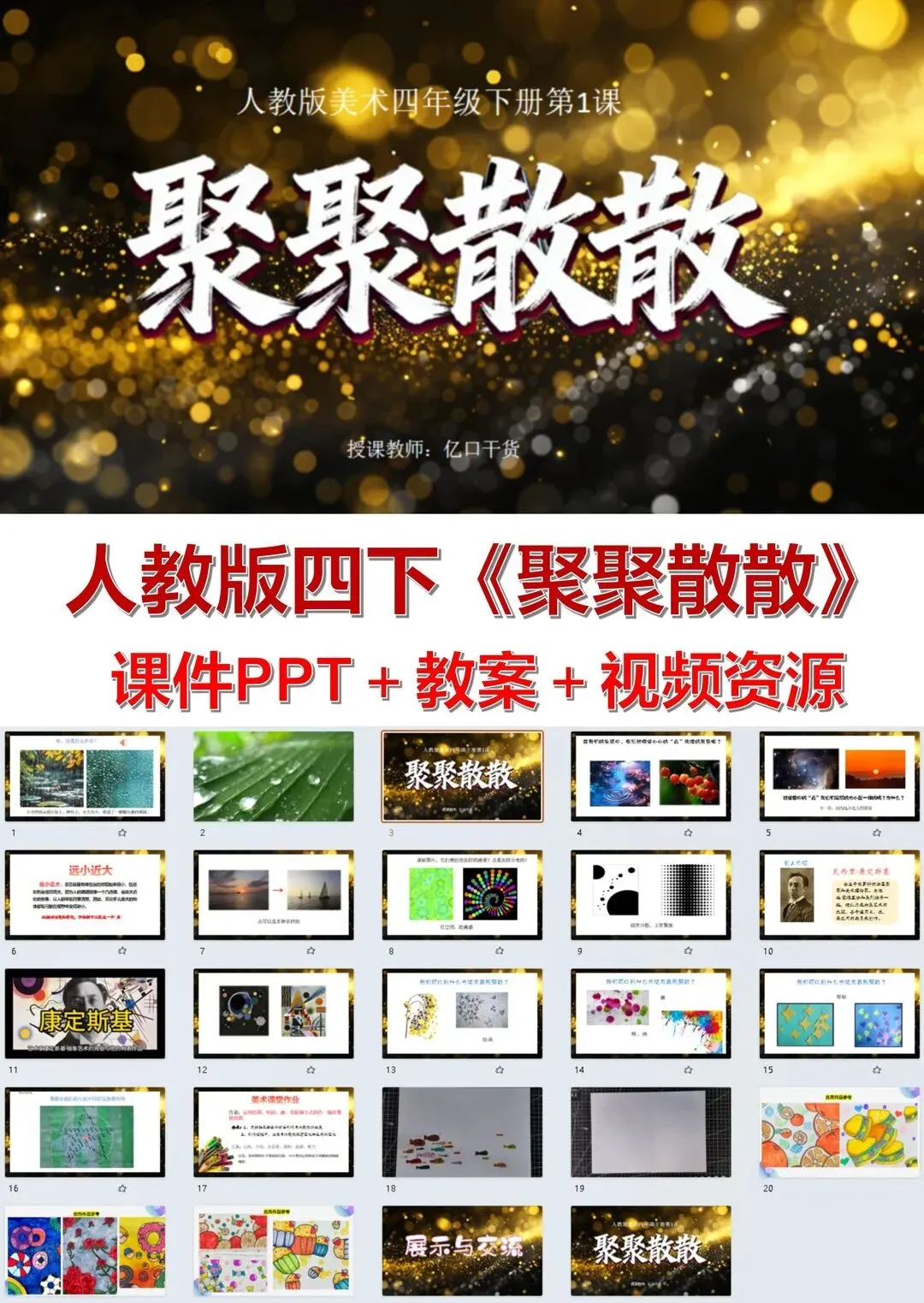 人教版美术四年级下册全套课件资源来了! 图1是四下教材的目录,标记每一节课的重点内容和圈记了适合上公开课的课程[飞吻R][飞吻R][飞吻R] [星R]全套课件资源丰富,包含以下资源 [一R]美术课件PPT [二R]教学设计 [三R]视频素材 [四R]电子版教材 [星R]人教版四下美术共1-20课 第1课 聚聚散散 第2课 点的魅力 第3课 "五谷"作画 第4课 主体与背景 第5课 色彩的明与暗 第6课 色彩的渐变 第7课 色彩的情感 第8课 我画的动漫形象 第9课对称的美 第10课 那一刻的我 第11课走进春天 第12课 平凡的美 第13课 吹塑纸版画 第14课藏书票 第15课 设计文化衫 第16课 千姿百态的帽子 第17课 会游的玩具 第18课 电脑美术"笔刷"画画 第19课 光的魅力 第20课珍爱国宝秦始皇陵及秦兵马俑本文内容来源于网络 版权归原作者所有、如有侵权,联系删除