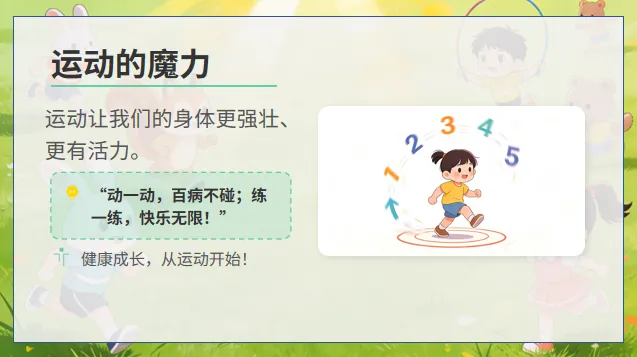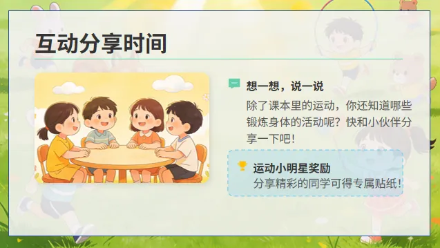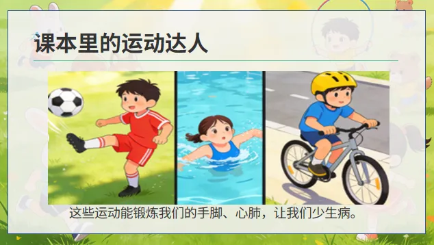 (1)认识运动的魔力:教师通过课件展示踢足球、游泳、骑自行车等运动图片,讲解这些运动能锻炼手脚、心肺,让身体更强壮、少生病。