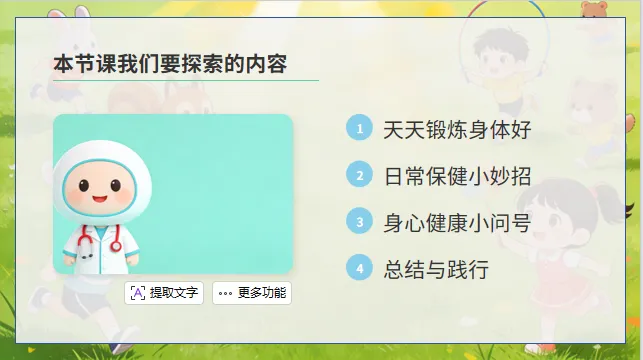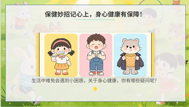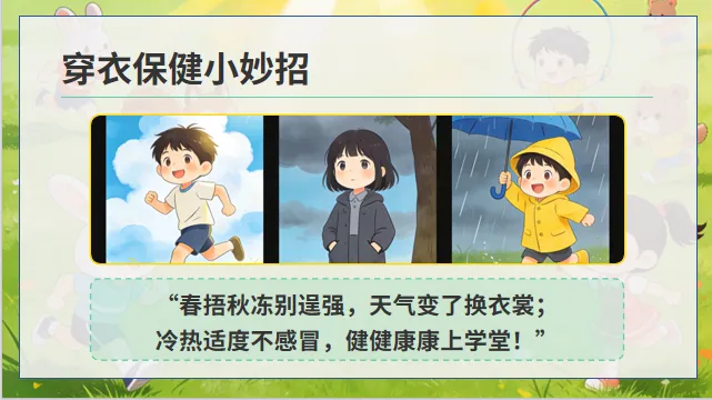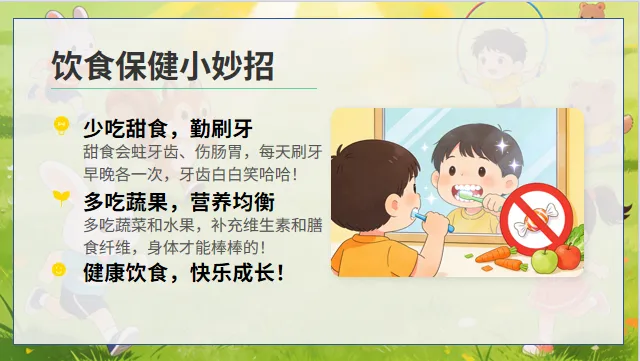- 重点介绍饮食保健:少吃甜食、勤刷牙,多吃蔬果补充维生素;结合“春捂秋冻别逞强”的谚语,讲解穿衣保健技巧。