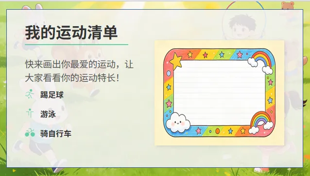 (2)分享运动清单:发放绘画模板,让学生画出自己最爱的运动,邀请学生上台展示并分享,教师为分享精彩的学生贴上专属贴纸。