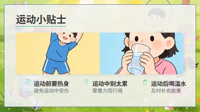 (3)学习运动小贴士:通过课件演示,强调运动前要热身、运动中量力而行、运动后喝温水的注意事项,带领学生做简单的热身动作。