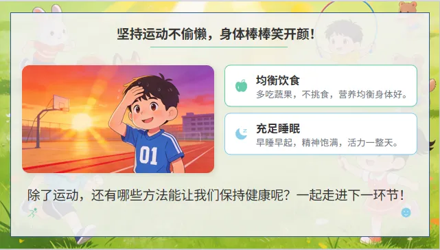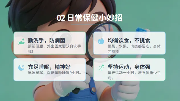- 课件展示勤洗手、均衡饮食、充足睡眠、坚持运动等妙招,讲解饭前便后洗手、不挑食、每晚睡够9小时、每天运动1小时的具体要求。