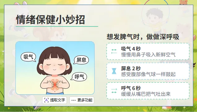 - 教师示范“吸气4秒、屏息2秒、呼气6秒”的深呼吸方法,带领学生反复练习,讲解该方法能缓解发脾气等不良情绪。