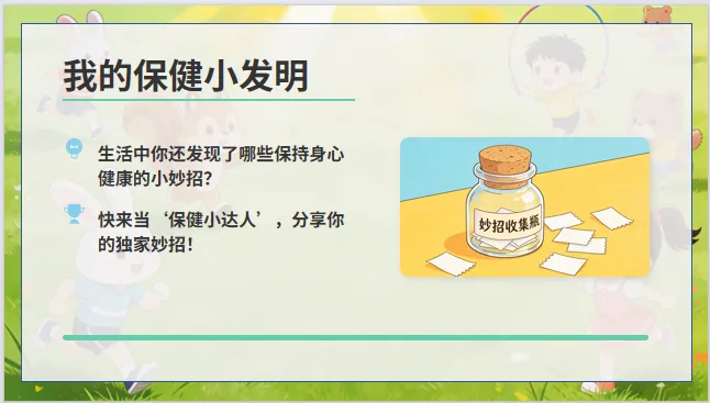 - 组织“保健小达人”分享活动,鼓励学生说出自己发现的其他保健小妙招,教师将妙招记录在“保健妙招收集瓶”中。