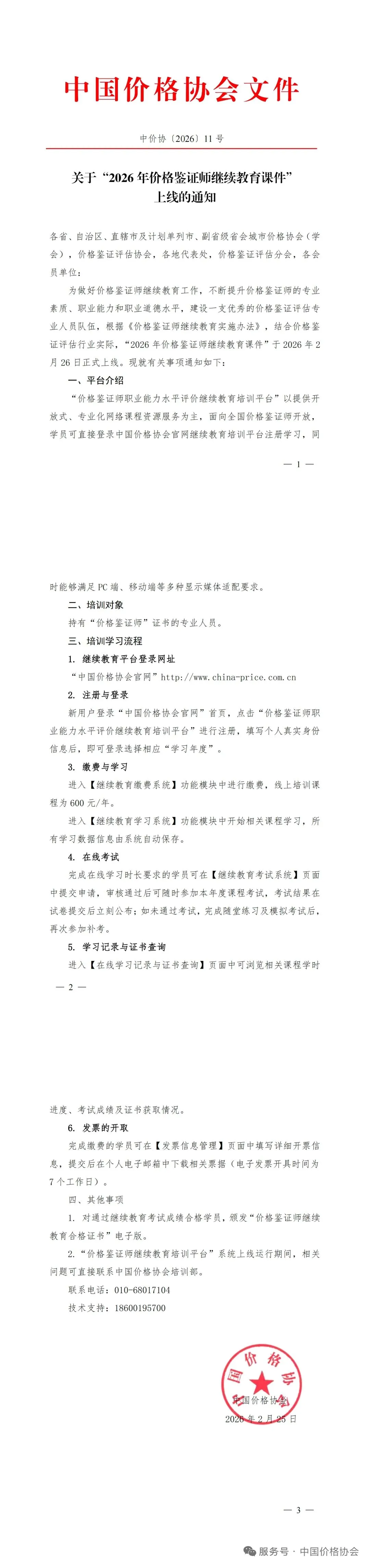 关于“2026年价格鉴证师继续教育课件”上线的通知
