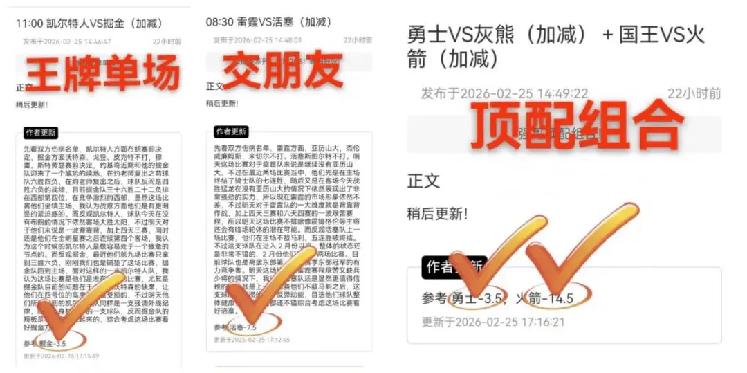 兄弟们,昨天五场比赛,咱们四场收获好评!除了公开课马刺稍稍让人失望以外,我们的上锁课件四场全部拿下!王牌单场,掘金回到主场面对四连胜的凯尔特人成功迎来反弹!这场我们重点分析了掘金的反弹欲望,虽然人员不算齐整,但是凯尔特人处于连续客场之旅+背靠背四天三赛的赛程,这场也是提前五分钟直接收兵。交朋友系列,活塞最后时刻有惊无险击穿残阵雷霆,这场昨天也是提前判断出了雷霆在这种赛程和战绩背景下不排除赛前临场轮休霍姆格伦,最终也是如我们所料。顶配组合方面,火箭大胜国王,勇士轻取灰熊的比赛都成功打出!明天美职篮将会迎来超级比赛日,我们精选其中8场,带着出色的状态继续为大家带来沉淀过后的精品内容!