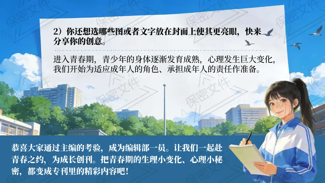 本课以“青春编辑部创专刊”为主线,将核心素养目标融入三大版块,层层递进;情境真实:贴近学生生活,激发参与热情。活动多元:绘画、表演、讨论、批注、点赞,充分调动多种智能;知行合一:从认知到实践,再到创造专属成长手册,让教育真正发生。