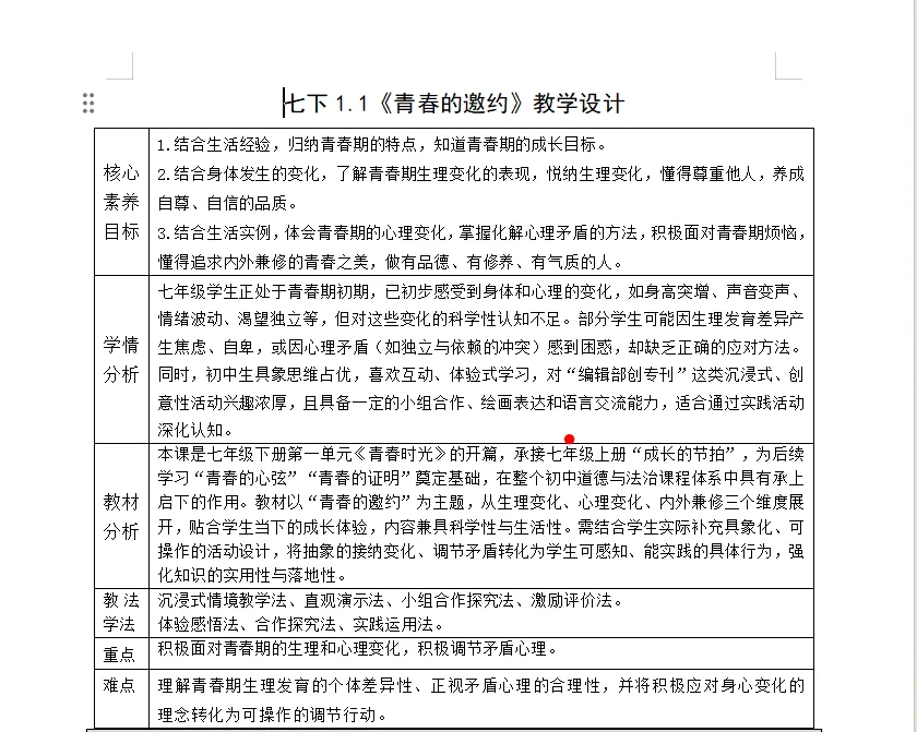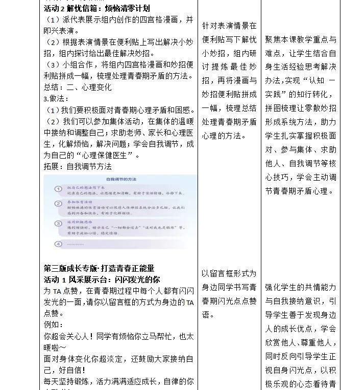 对于道德与法治教师而言,这份设计不仅提供了可操作的教案,更展示了如何将抽象的身心变化转化为学生可感、可践行的成长体验,值得细细品味与借鉴。