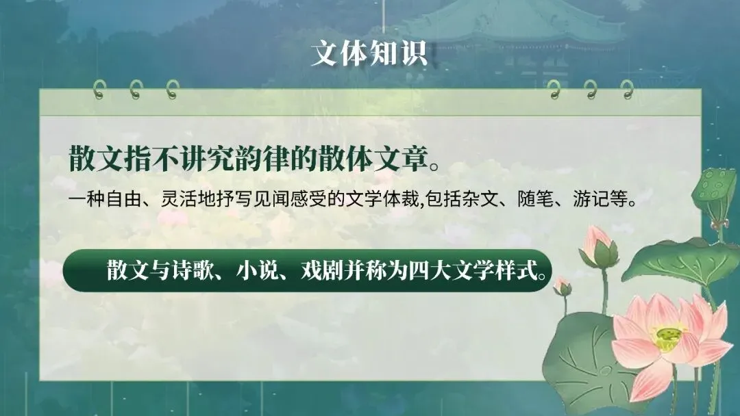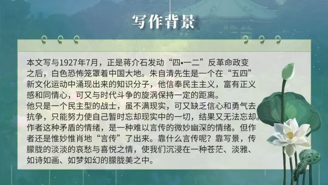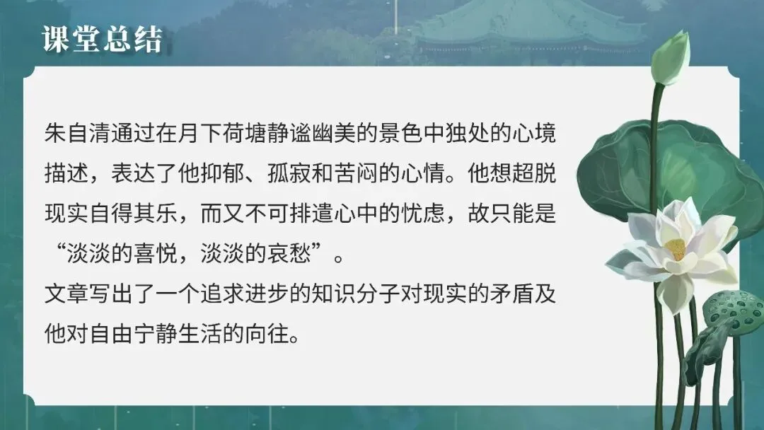 课文是朱自清的抒情散文,描绘了夜晚荷塘的宁静美景,表达了作者的淡淡喜悦与哀愁。教学中强调情景交融和语言鉴赏,旨在提升学生的语言和审美能力,体会作者情感。教学重点在于理解散文的情感和修辞手法,难点在于深入领会作者情感的微妙变化。