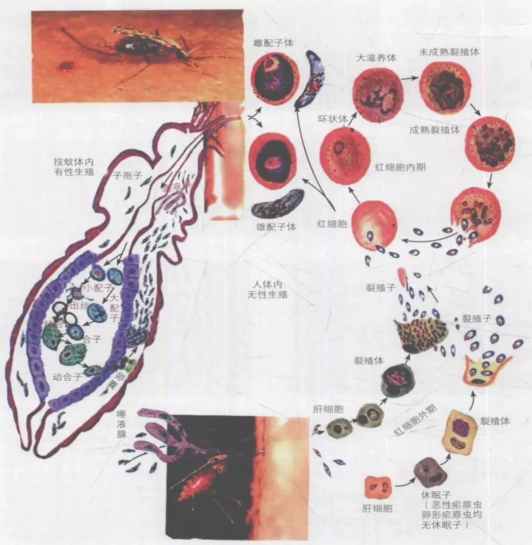 按蚊叮咬人体后,子孢子随血液入侵肝细胞,子孢子在肝细胞内裂体增殖为裂殖体。裂殖体不断增值成裂殖子,后裂殖体破裂,裂殖子散出,一部分被吞噬细胞吞噬,另一部分进入红细胞内进行红细胞内的发育繁殖。