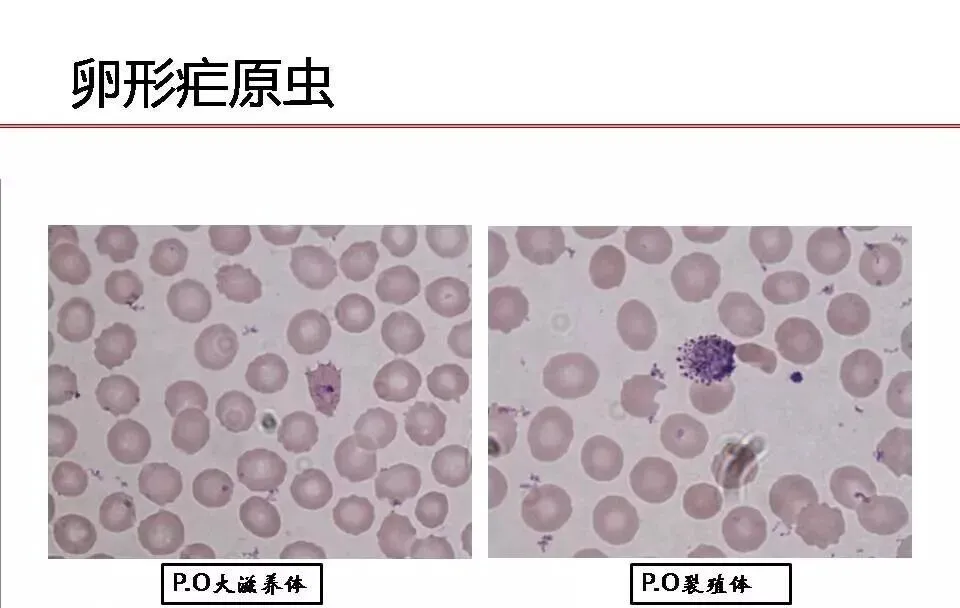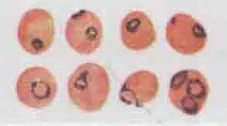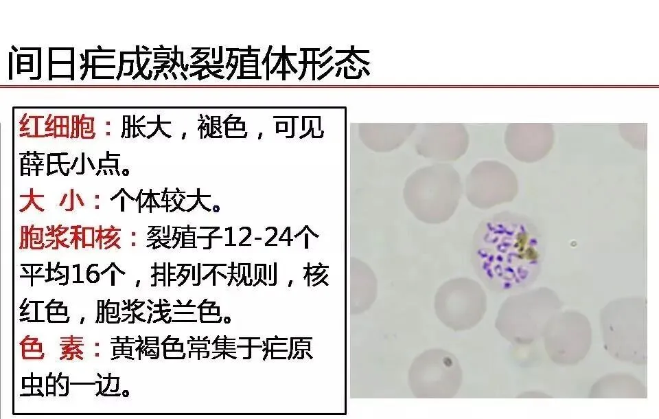 裂殖子 | 在外周血中看不到,8-36个,通常18-26个 | 虫体充满涨大的RBC,裂殖子12-24个,常16-18个,排列不规则,常聚集一侧 | 裂殖子较大6-12个,常8个,排列成菊花状 | 似三日疟原虫,但裂殖子稍大,排列不规则,6-12个,常8个 | |