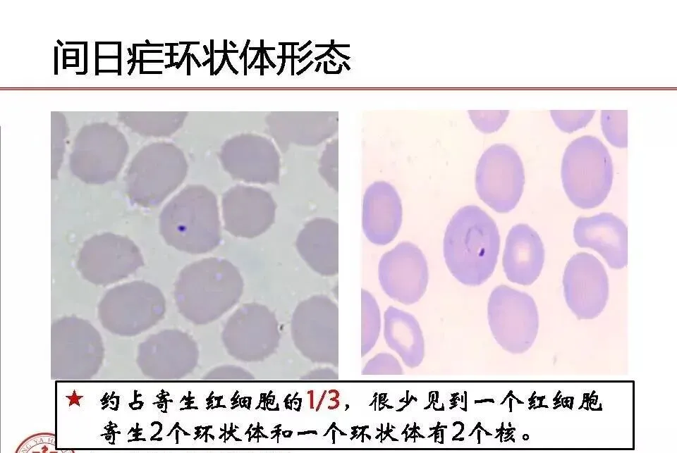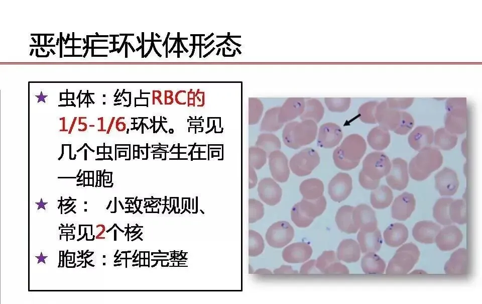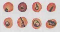 环状体 | 大小 | 约为红细胞直径1/6-1/5,环纤细 | 约为红细胞直径的1/3,环较粗大 | 约为红细胞直径的1/3,环较粗 | 约为红细胞直径的1/3 |