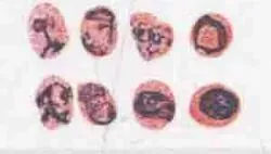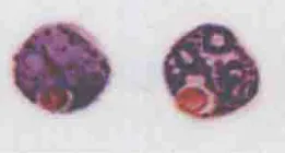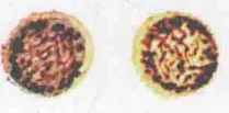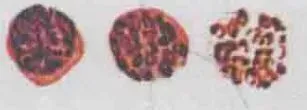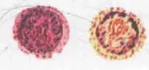 核 | 1个,较小,深红色,位于中央 | 1个,致密 较小,深红色,偏向一侧 | 1个,较小,深红色,偏于一侧 | 1个,较小,深红色,偏于一侧 | |