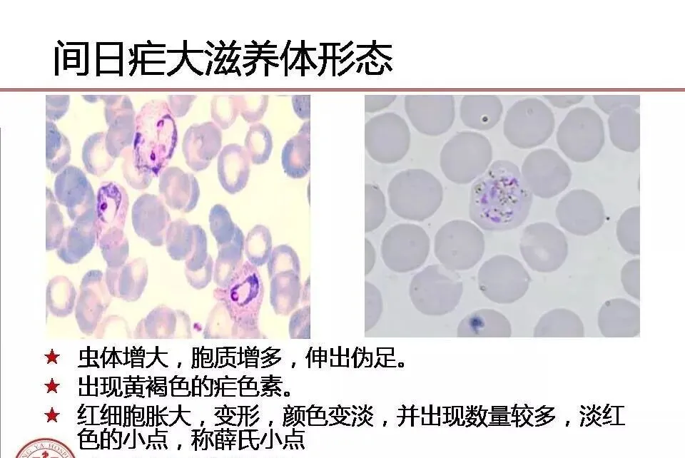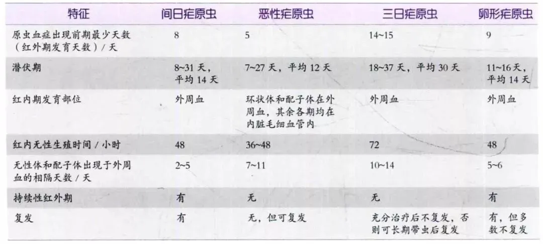 色素 | 黄褐色,细小,短杆状,细小分布 | 早期疟色素细小,金黄色,晚期结成块状,黑褐色 | 较粗大,深褐色,常沿虫体边缘分布 | 棕黄色,较粗大 | |