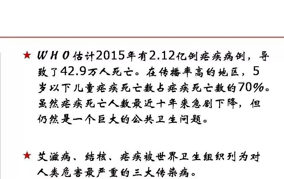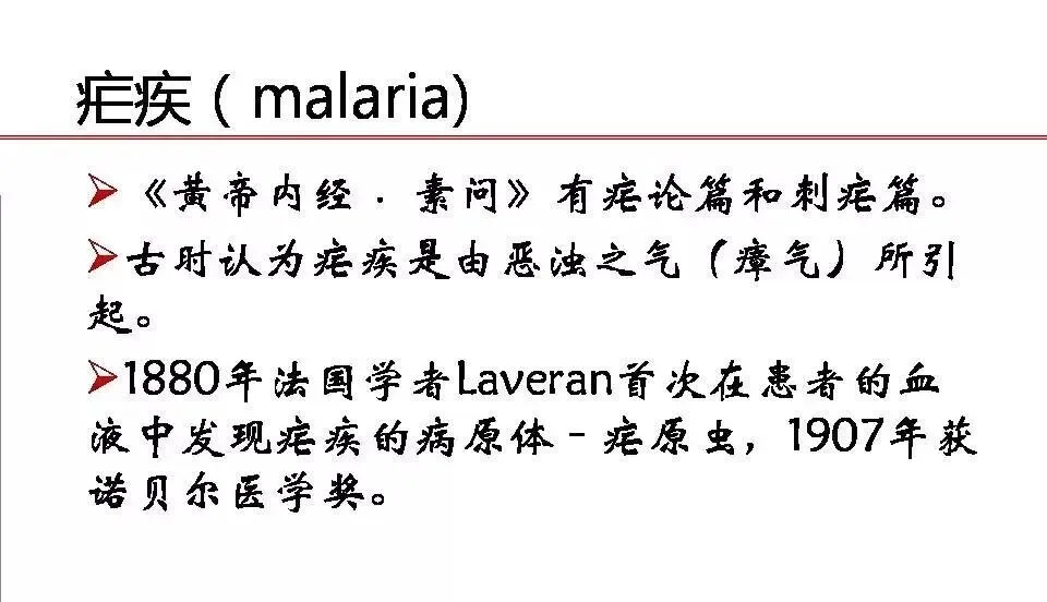 2011年9月我国著名药学家屠呦呦教授及其团队发现青蒿素——一种用于治疗疟疾的药物,此举挽救了全球特别是发展中国家的数百万生命。同年,屠呦呦教授获得拉斯克奖和葛兰素史克中国研发中心“生命科学杰出成就奖”2015年10月,屠呦呦教授获得诺贝尔生理学或医学奖,理由是,她发现青蒿素,这种药品可以有效降低疟疾患者的死亡率。为全球抗疟做出重大贡献。那么作为检验工作者,我们来了解下所谓疟疾,如何精准识别吧!