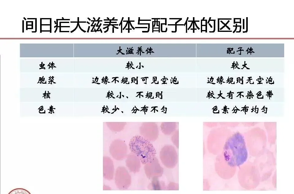 大 滋 养 体 | 大小 | 中等大小,一般不出现在外周血,主要集中在内脏毛细血管 | 较大 | 体小 | 体较三日疟原虫大 |