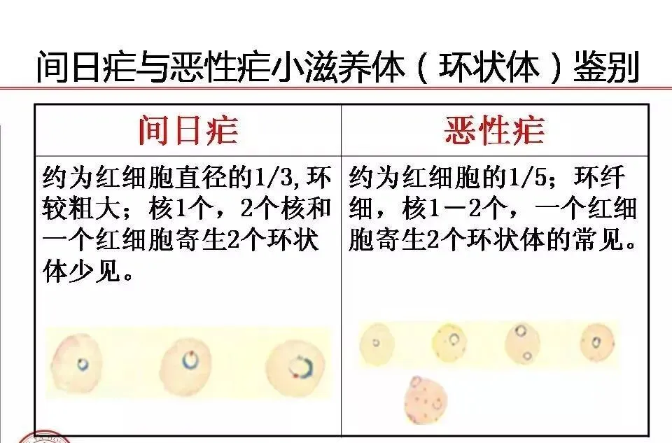 鉴别点 | 恶性疟 | 间日疟 | 三日疟 | 卵形疟 | |