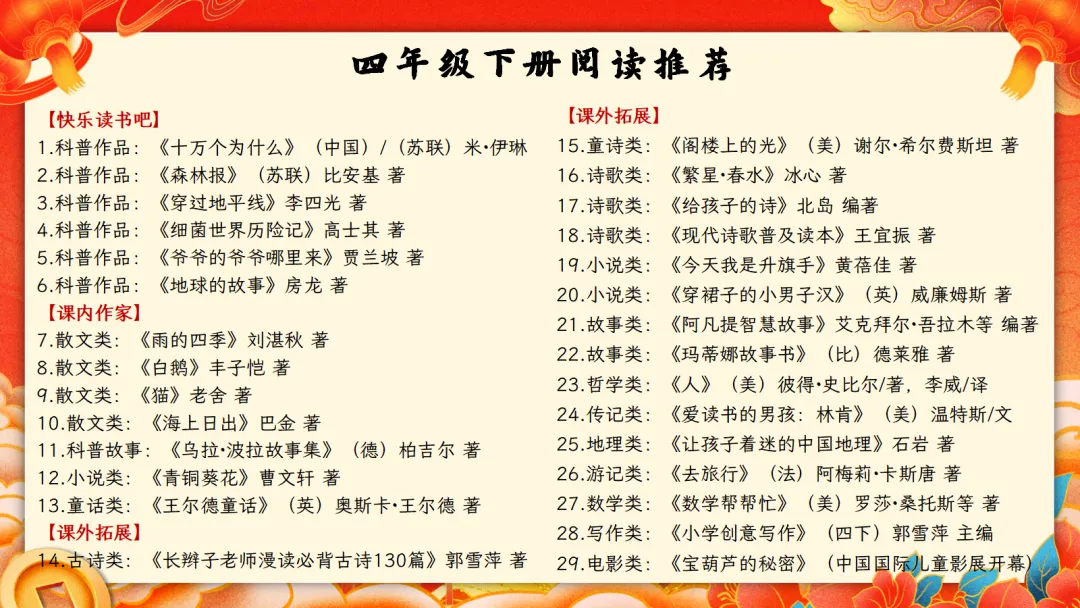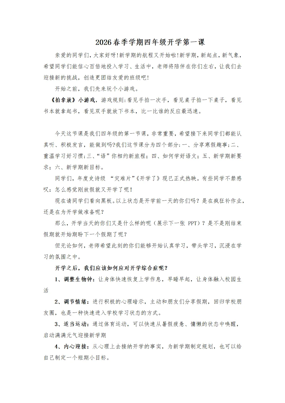 为了方便广大教师备课和日常教学需要及各位家长辅导孩子学习,本人紧紧围绕着新版教材,从编写理念、指导原则、教材内容的选排等方面,精心整理了2026春小学语文四年级开学第一课课件及发言稿