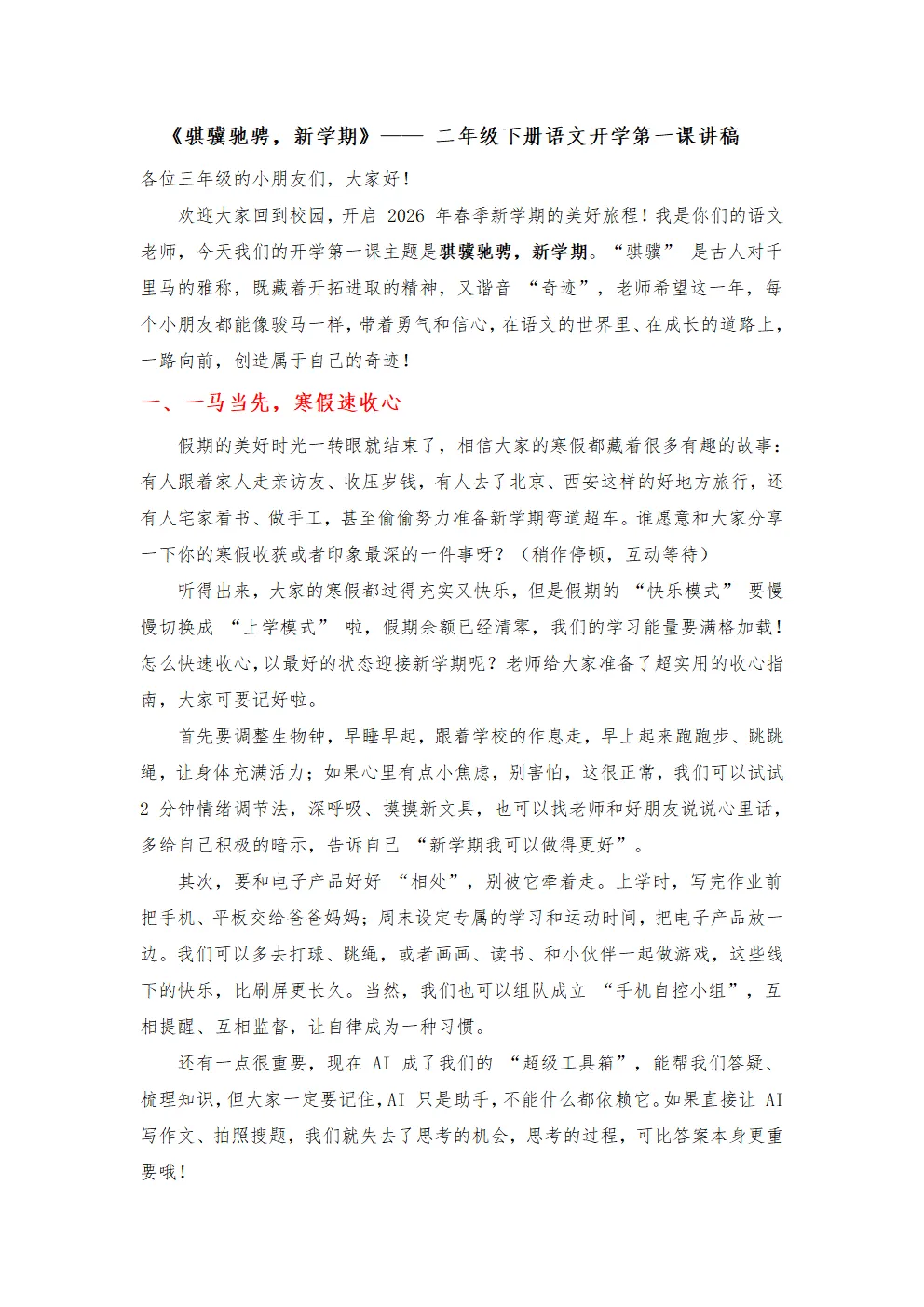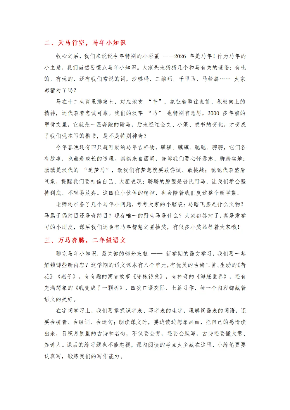 为了方便广大教师备课和日常教学需要及各位家长辅导孩子学习,本人紧紧围绕着新版教材,从编写理念、指导原则、教材内容的选排等方面,精心整理了2026春小学语文二年级开学第一课课件及发言稿