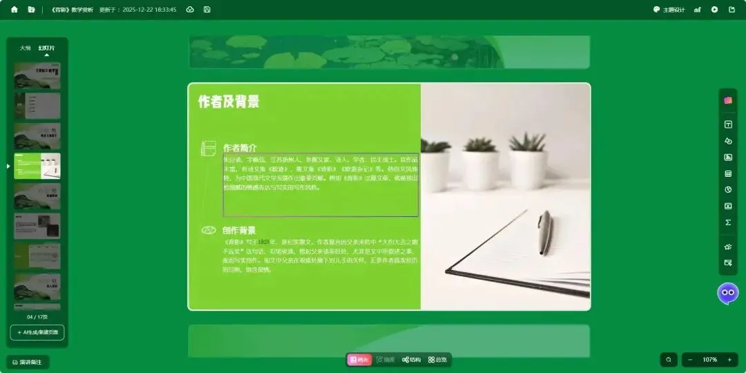 Gamma主打“3分钟上手”理念,通过拖拽式操作和预设模板库,大幅降低课件制作门槛。其亮点在于“一键换色”功能,可快速统一课件视觉风格。