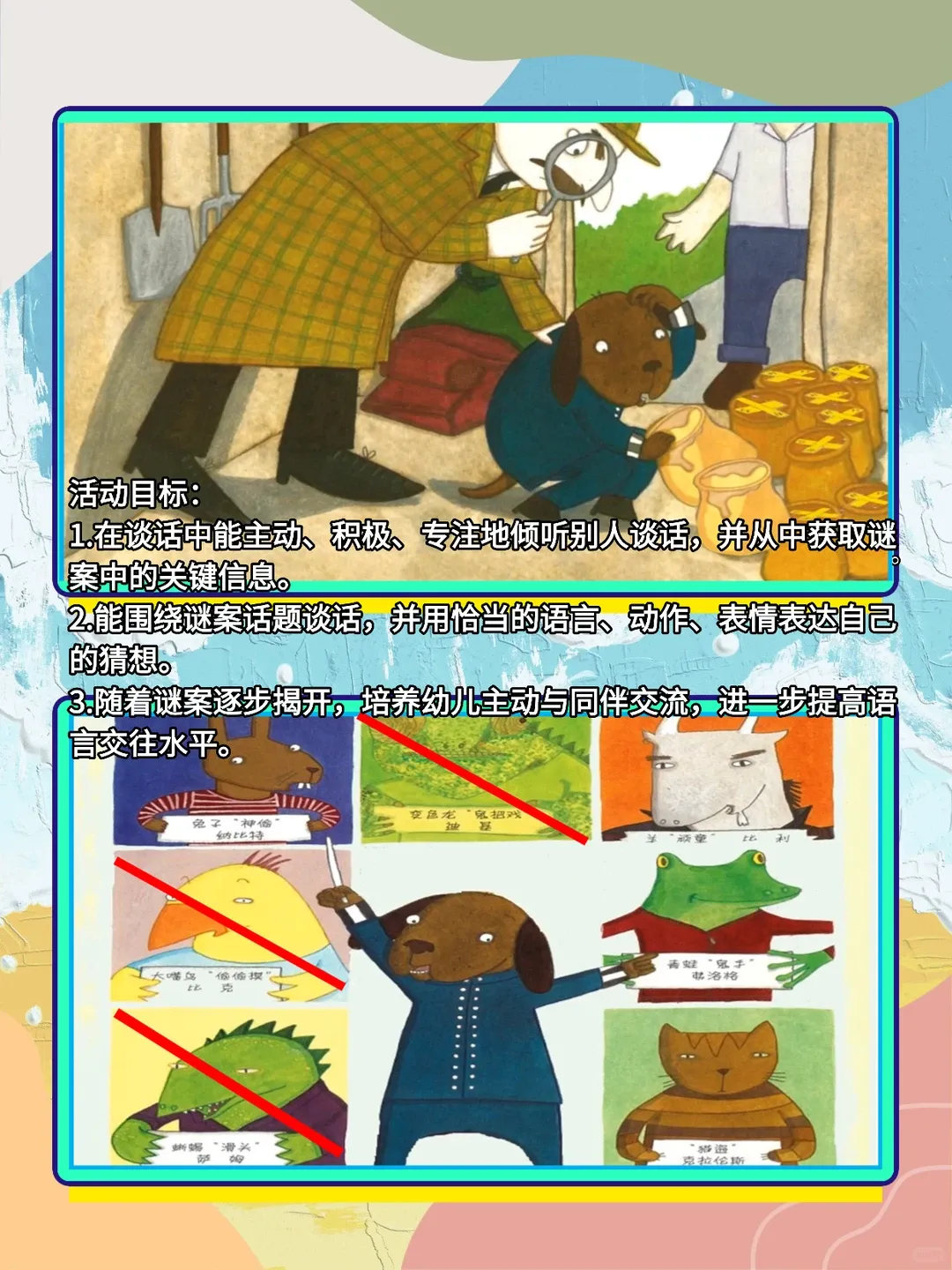 2.能围绕谜案话题谈话,并用恰当的语言、动作、表情表达自己的猜想。