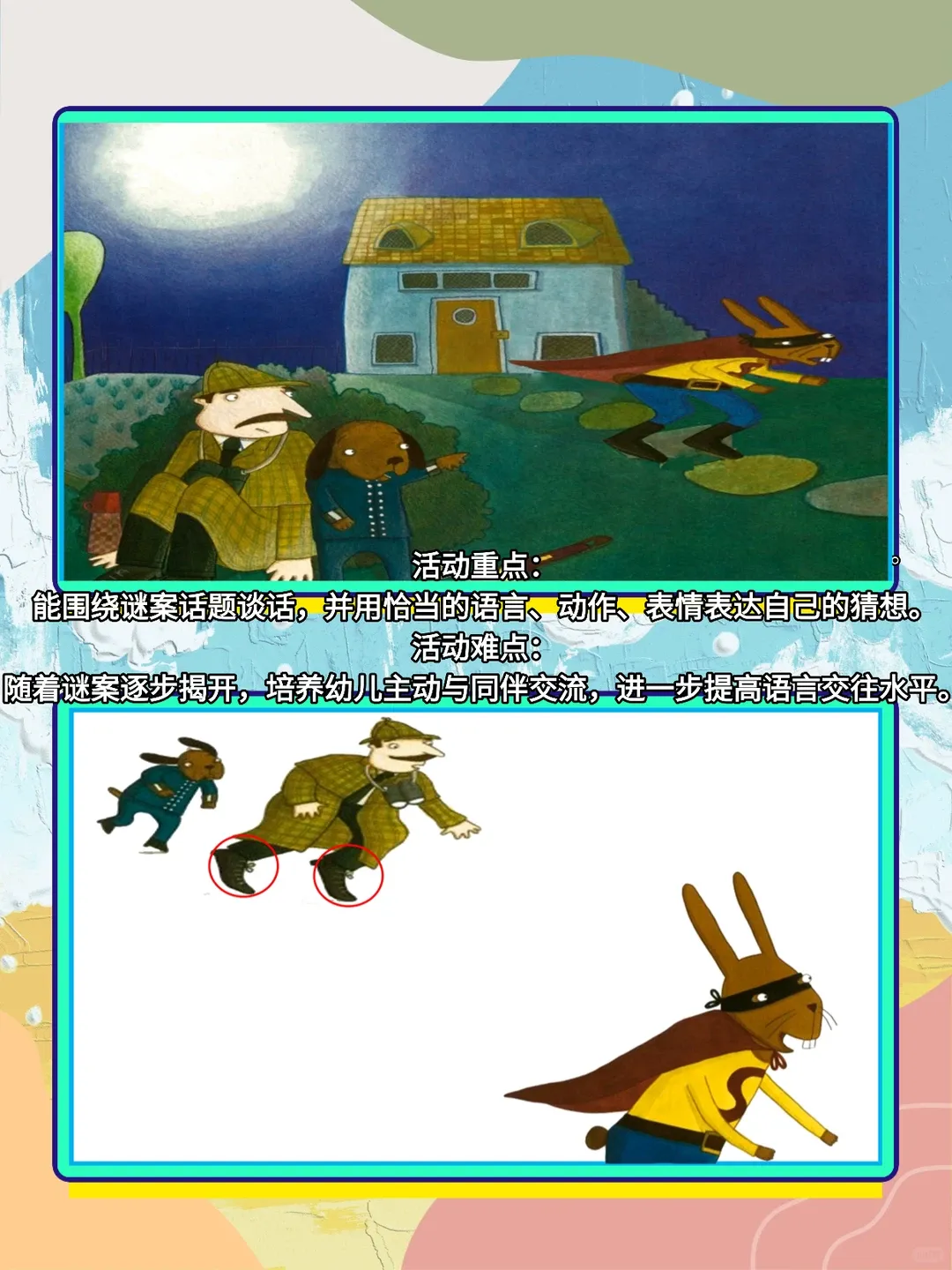 合大班年龄爱探意图索、推理的兴趣和特点,通过谈话,在疑点重重、环环相扣的破案情境中,能让
