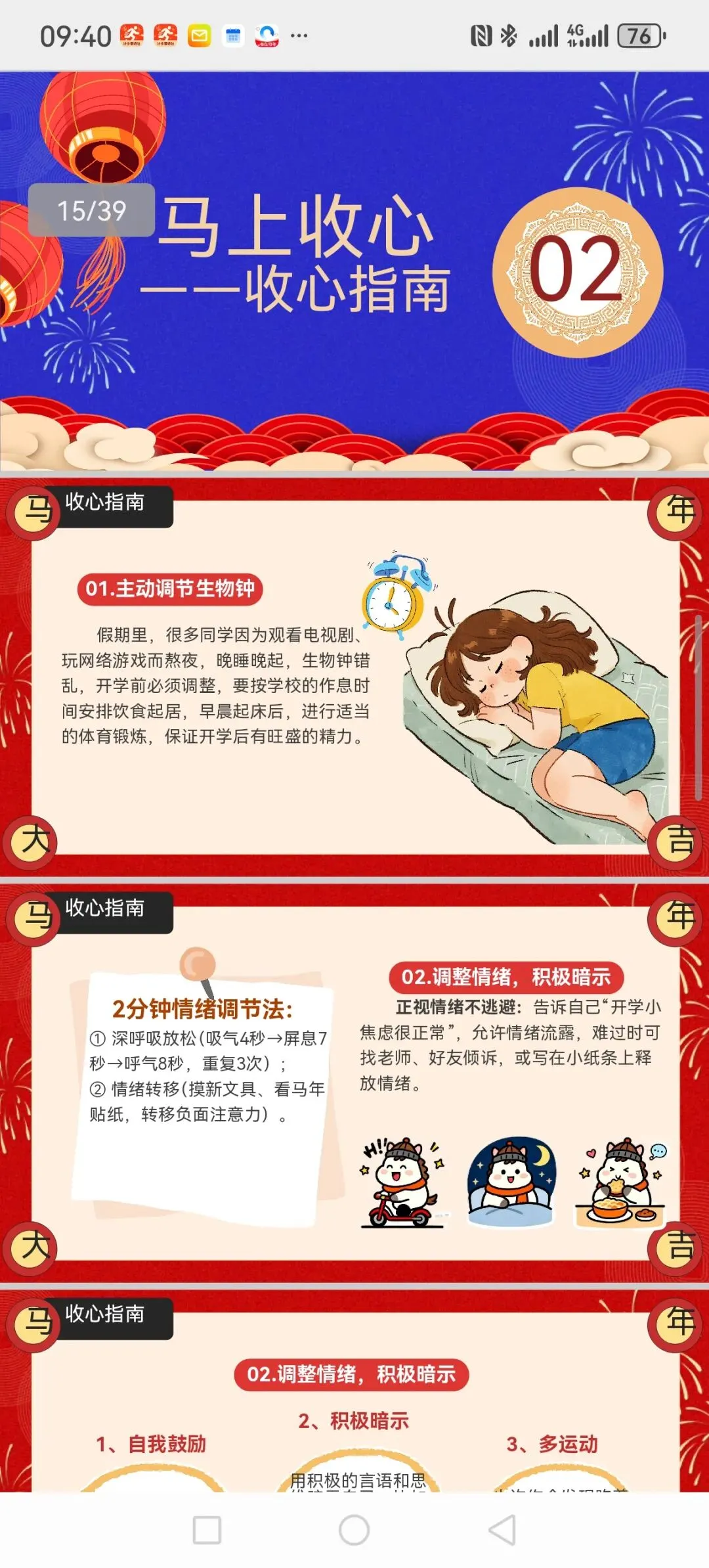 开学第一课是收心归位、调整状态的心理桥梁。经过假期的放松,学生普遍存在作息不规律、注意力分散、学习动力不足等问题,心理上仍停留在自由散漫的状态中。开学第一课以温和而有序的方式,帮助学生完成从家庭到校园、从休闲到学习的角色转换。教师通过轻松的交流、温馨的氛围营造,让学生快速熟悉环境、接纳集体,消除陌生感与焦虑感,逐步收束散漫的心思,将注意力转移到学习上来。良好的开端是成功的一半,平稳顺利的状态过渡,能让学生以积极、饱满、专注的精神面貌迎接新学期,避免因适应不良导致学习滞后、情绪低落等问题,为整个学期的稳定发展打下心理基础。