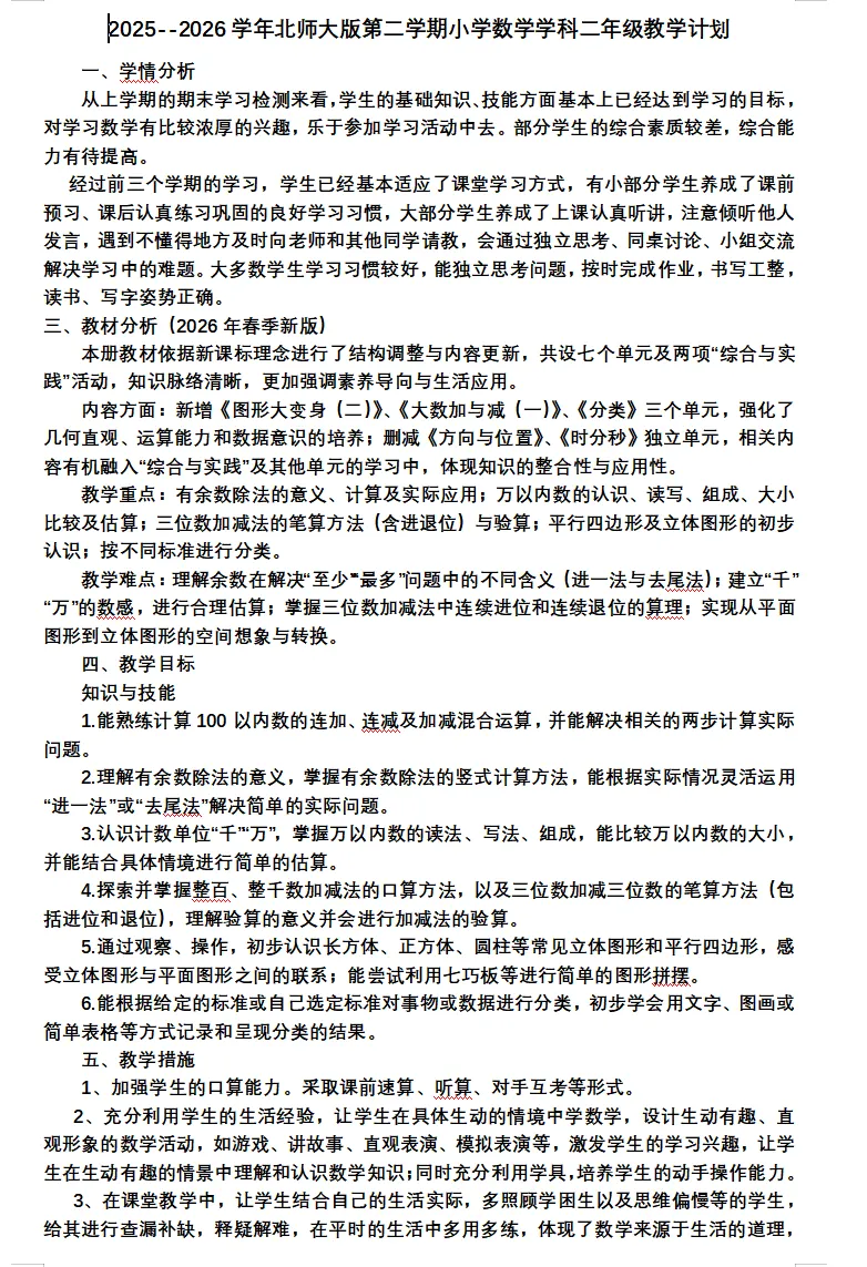 【教学资料】2026春二下数学教案课件教学计划(北师大版本)