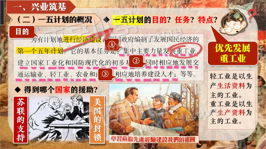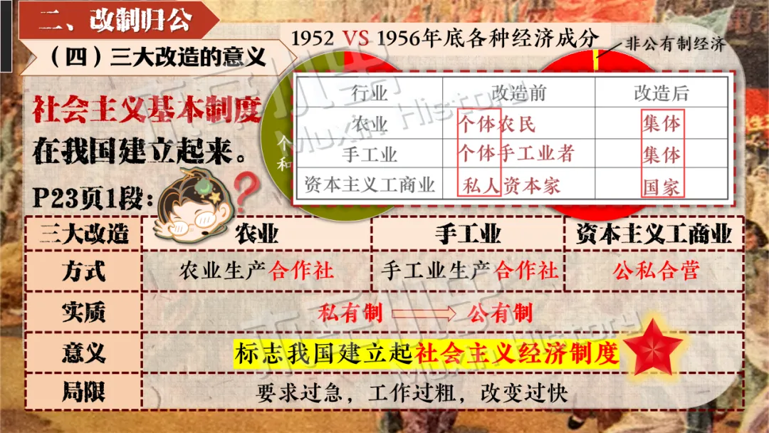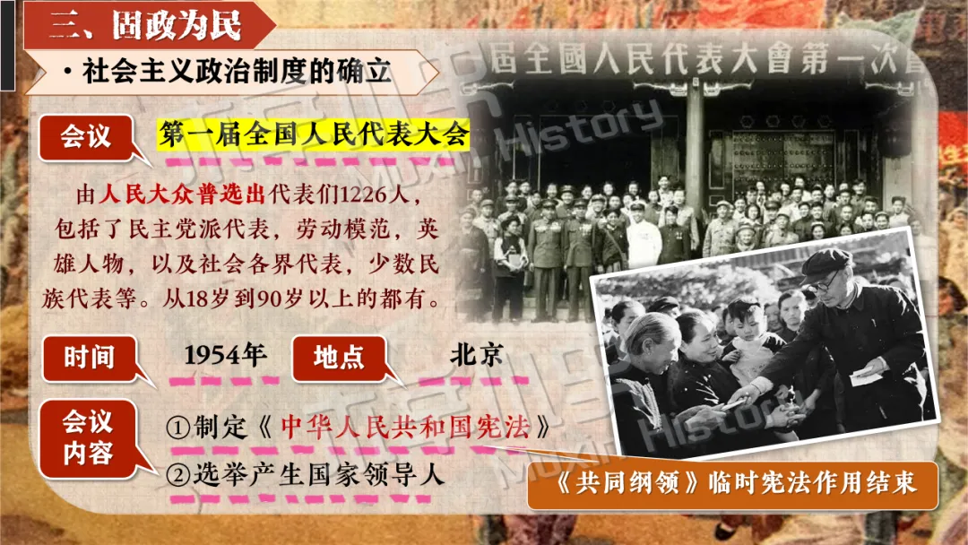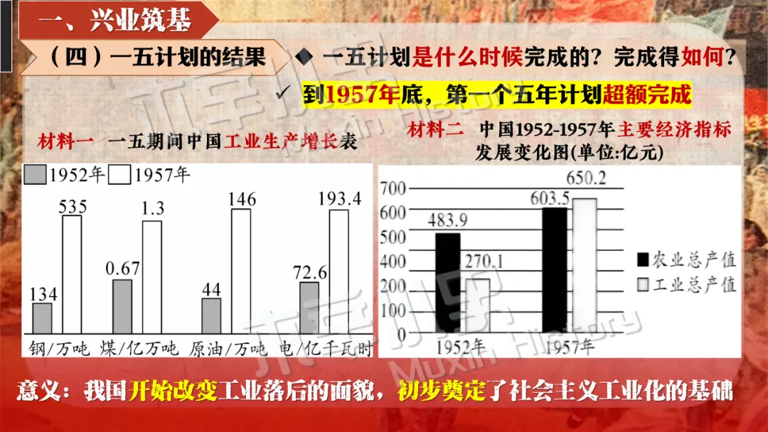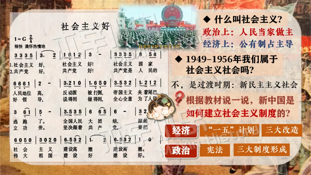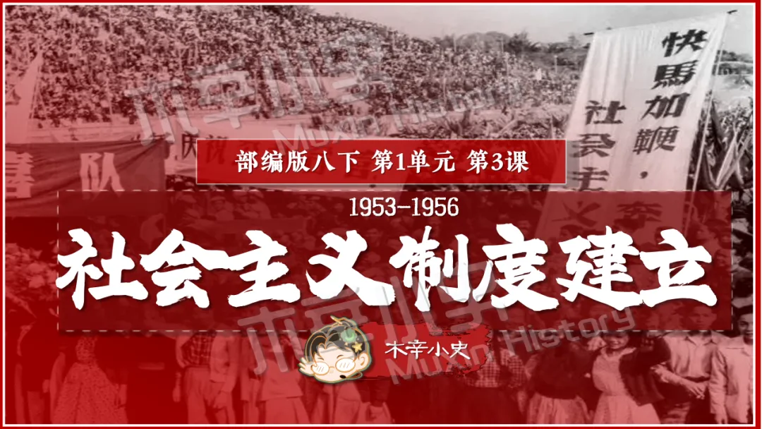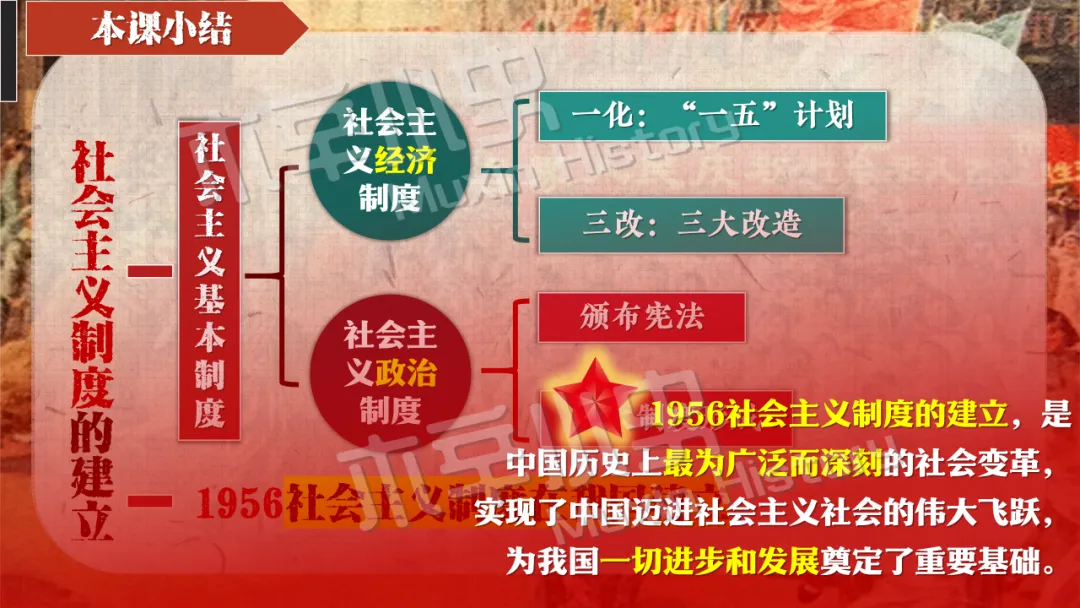 本课线索其实就隐藏在标题当中。关于社会主义制度一词,要分为经济和政治两方面来看,一是社会主义经济制度,涉及知识点为一化三改,也就是一五计划和三大改造。二是社会主义政治制度,涉及知识点为宪法的颁布及三大制度(人民代表大会制度、多党合作和政治协商制度、民族区域自治制度)的形成。 关于建立一词,什么时候建立的呢?1956,也就是三大改造基本完成的时间。建立有什么意义呢?社会主义制度的建立,是中国历史上最为广泛而深刻的社会变革,实现了中国迈进社会主义社会的伟大飞跃,为我国一切进步和发展奠定了重要基础。我国从此进入社会主义初级阶段。同时这也解放了生产力,促进了工业和农业的迅速发展。