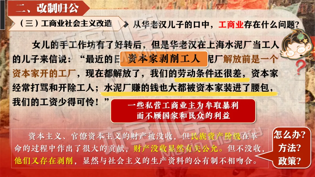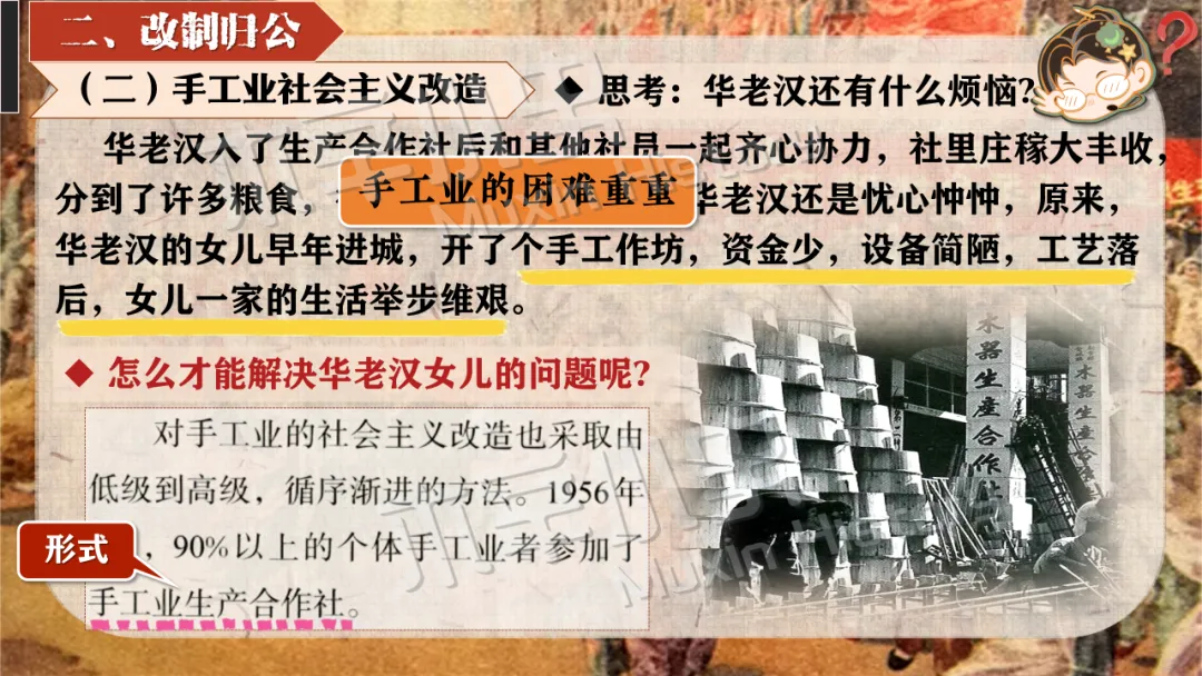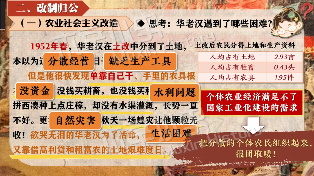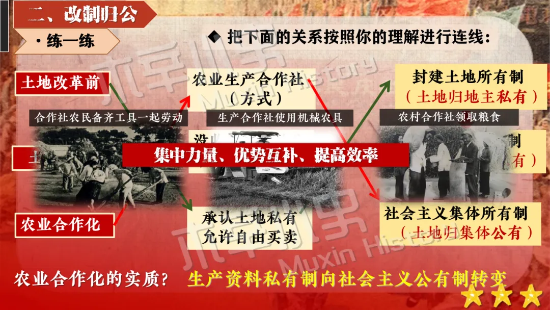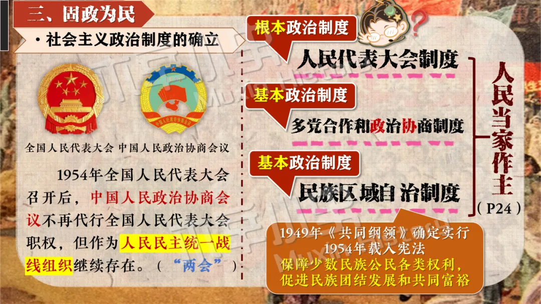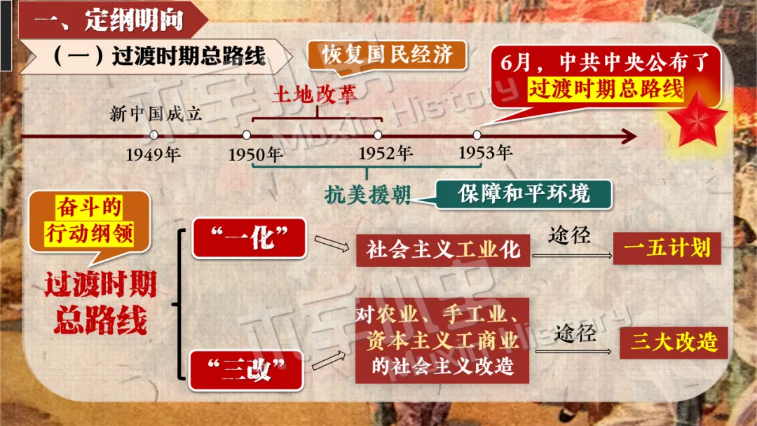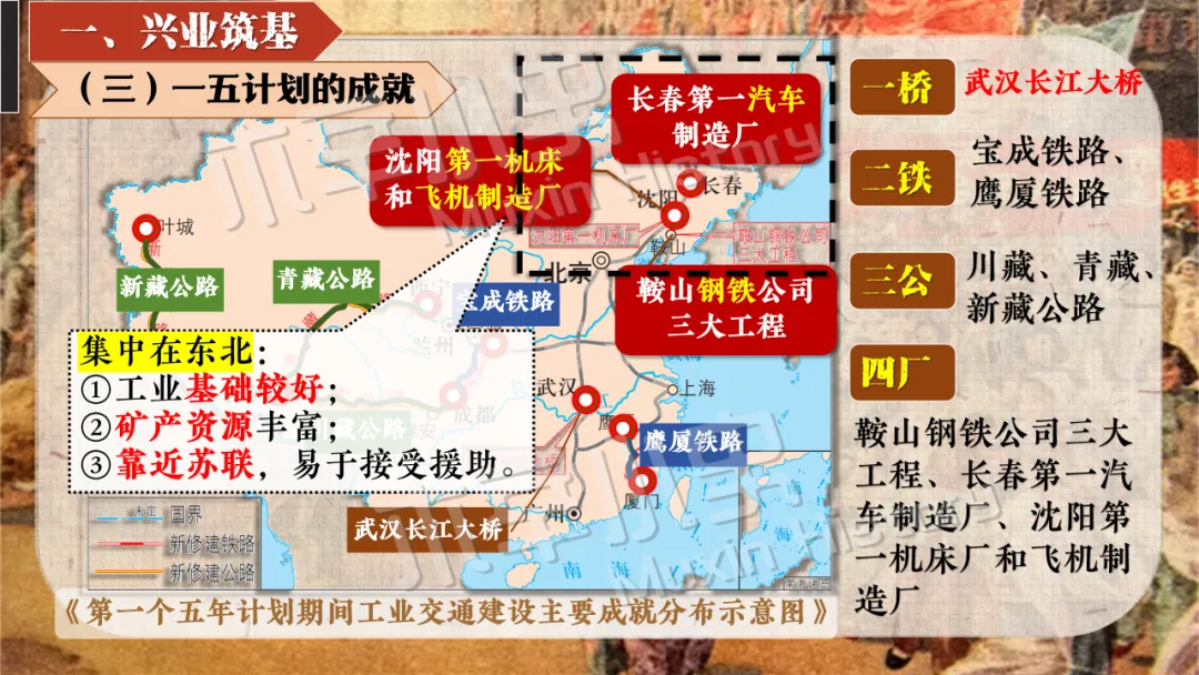 本课线索其实就隐藏在标题当中。关于社会主义制度一词,要分为经济和政治两方面来看,一是社会主义经济制度,涉及知识点为一化三改,也就是一五计划和三大改造。二是社会主义政治制度,涉及知识点为宪法的颁布及三大制度(人民代表大会制度、多党合作和政治协商制度、民族区域自治制度)的形成。 关于建立一词,什么时候建立的呢?1956,也就是三大改造基本完成的时间。建立有什么意义呢?社会主义制度的建立,是中国历史上最为广泛而深刻的社会变革,实现了中国迈进社会主义社会的伟大飞跃,为我国一切进步和发展奠定了重要基础。我国从此进入社会主义初级阶段。同时这也解放了生产力,促进了工业和农业的迅速发展。
