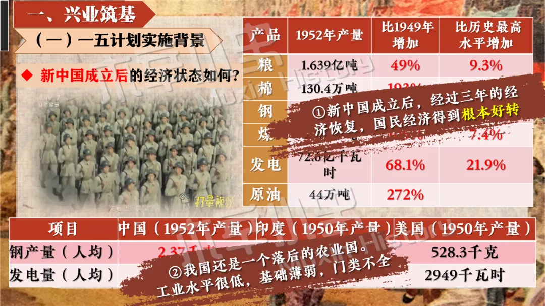 1950-1951年,我们完成了土地改革,实现了国民经济的初步恢复。 1950-1953年,抗美援朝、保家卫国,保障了国内的和平发展环境。