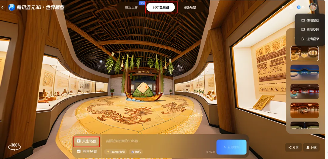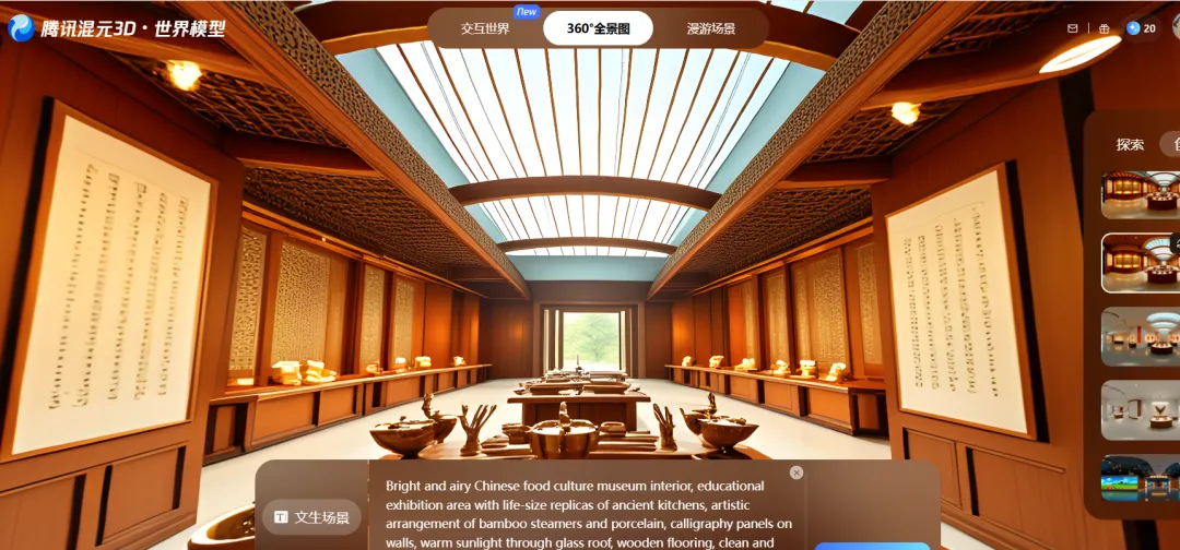 后来我终于发现了一个完全免费的替代工具——【腾讯混元3D世界模型】。每天有20次免费生成的机会,对于我们做一个VR课件需要用到全景图来说,妥妥够用了。第一步,我会先用Deepseek生成关键词。比如我想做“介绍中国饮食文化”的全景图,就可以输入提示词:我现在正在使用一个文生全景图的工具,请帮我生成一个介绍中国饮食文化的全景图,请帮我整理一些关键词,用于生成全景图。第二步,把Deepseek生成的英文关键词复制到【腾讯混元3D世界模型】里,选择360全景图 → “文生场景”,等一会儿,就能看到生成结果了。满意的话,直接点击下载就可以用啦~