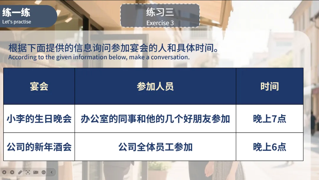 练习三:针对 “小李的生日晚会” 和 “公司的新年酒会”,询问参加人员和具体时间。