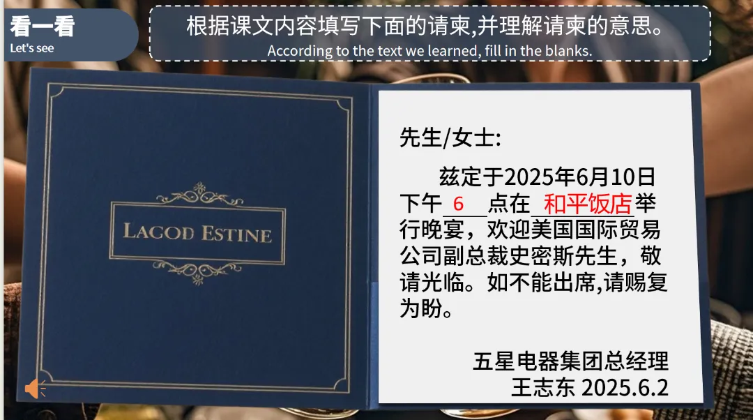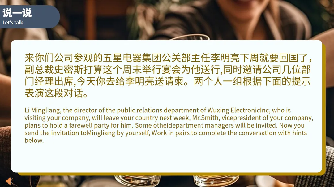 说一说:模拟为即将回国的李明亮主任举办送别宴会的场景,完成送请柬的对话。