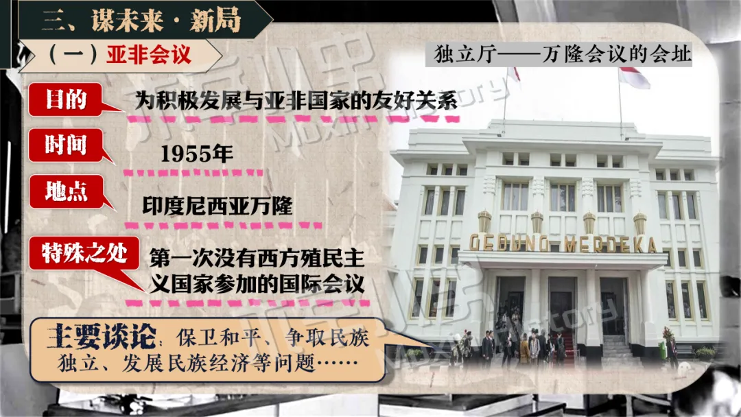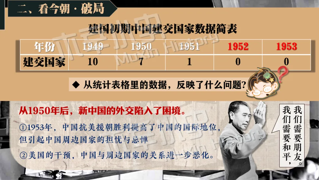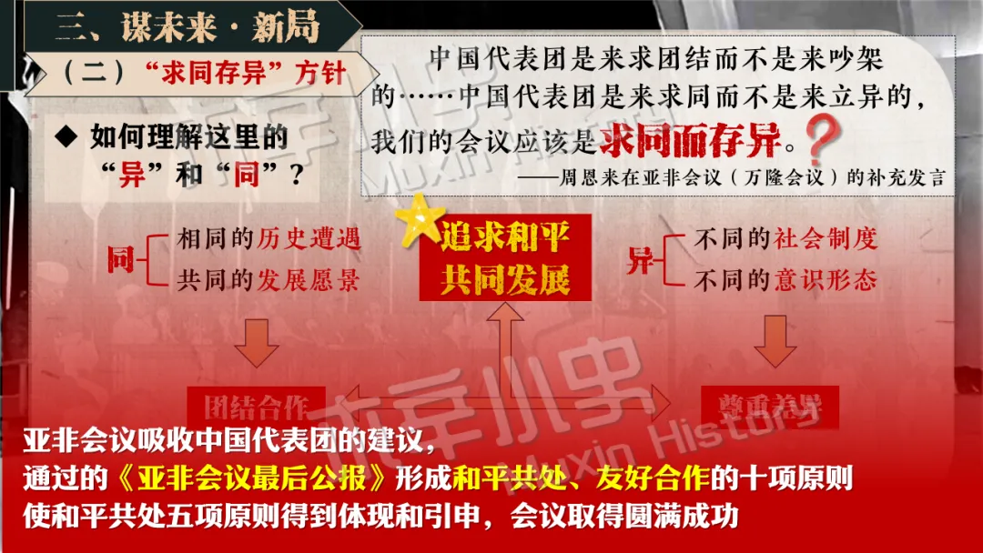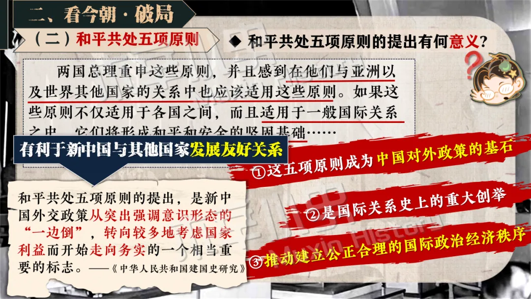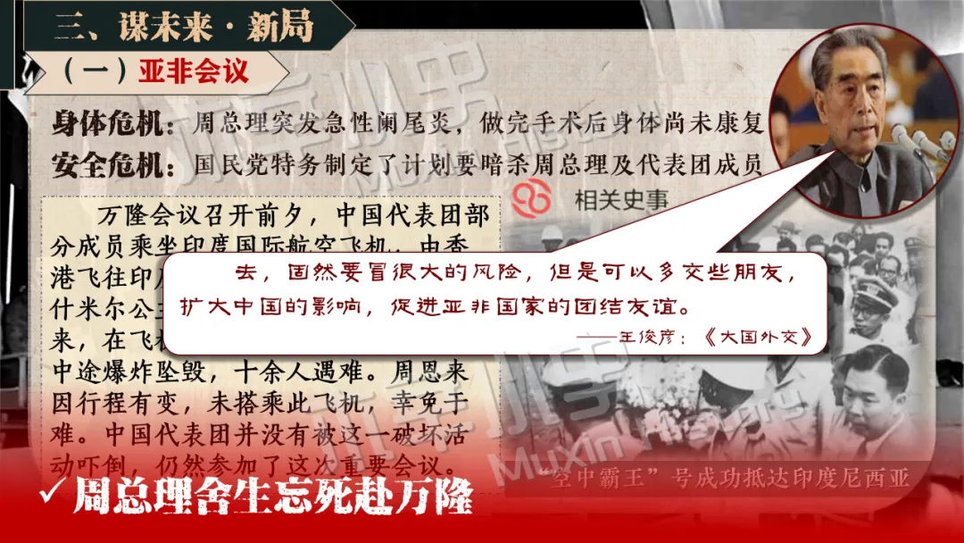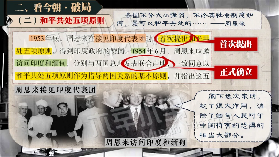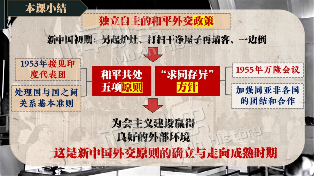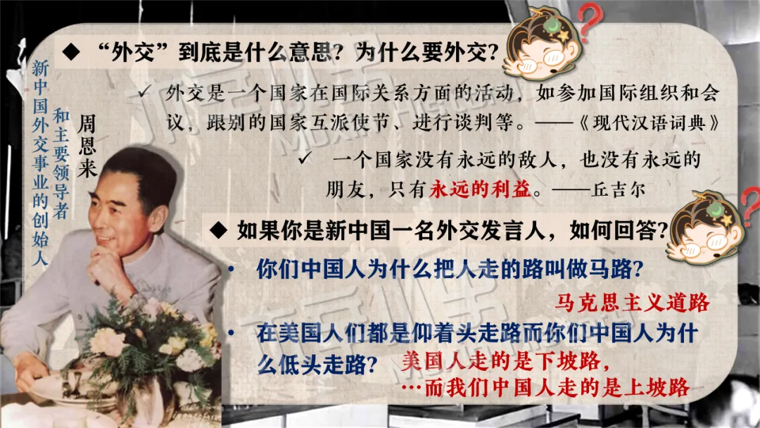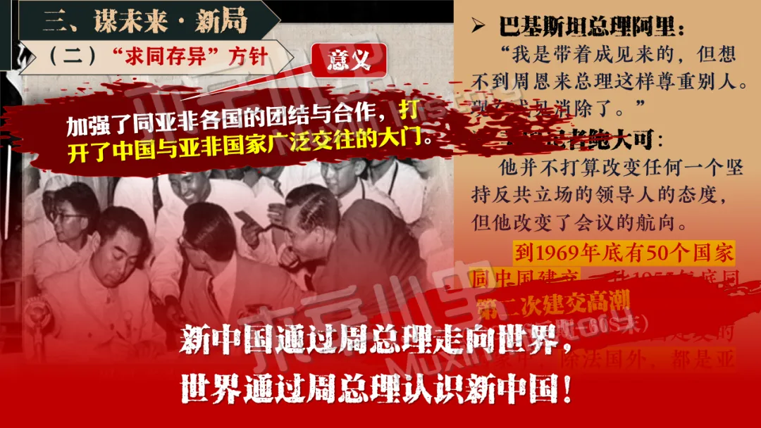 本课将学习到的他提出的和平共处五项原则、求同存异等外交思想至今仍在指导中国的外交工作。1976年1月8日,周恩来在北京病逝,享年78岁。设在美国纽约的联合国总部门前的联合国旗降了半旗一周。