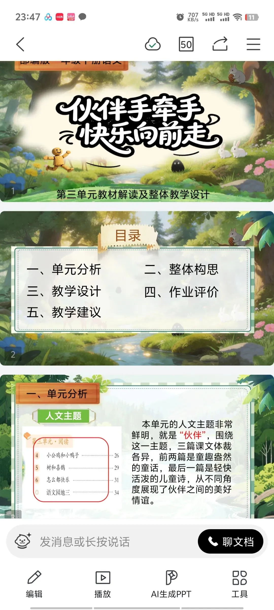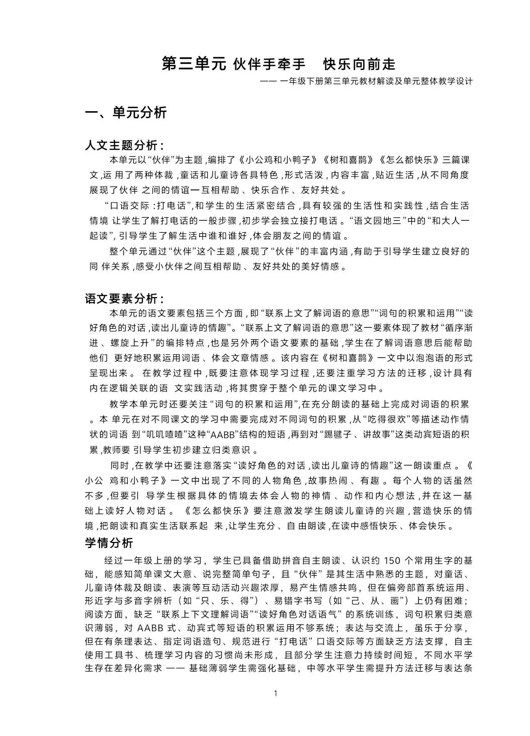 今天我们齐聚一堂,共同探讨部编版小学语文一年级下册第三单元 “伙伴手牵手 快乐向前走” 的教材解读与单元整体教学设计。新课标提出语文教学要立足核心素养,以学习任务群为载体,整合人文主题与语文要素,实现学生语文能力的综合发展。本单元作为一年级下册的重要学习单元,紧扣新课标精神,以 “伙伴” 为人文主线,将童话、儿童诗等文体融合,把识字写字、阅读朗读、口语交际等能力训练有机结合,既贴合低年级学生的认知特点,又落实了第一学段的语文学习要求。