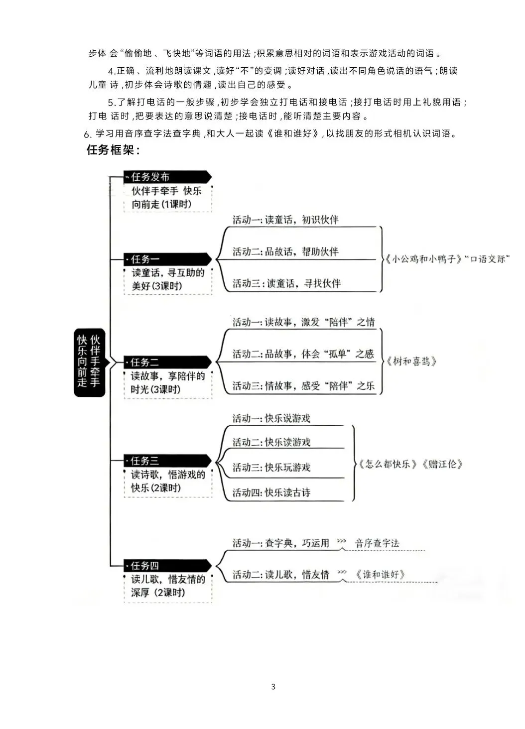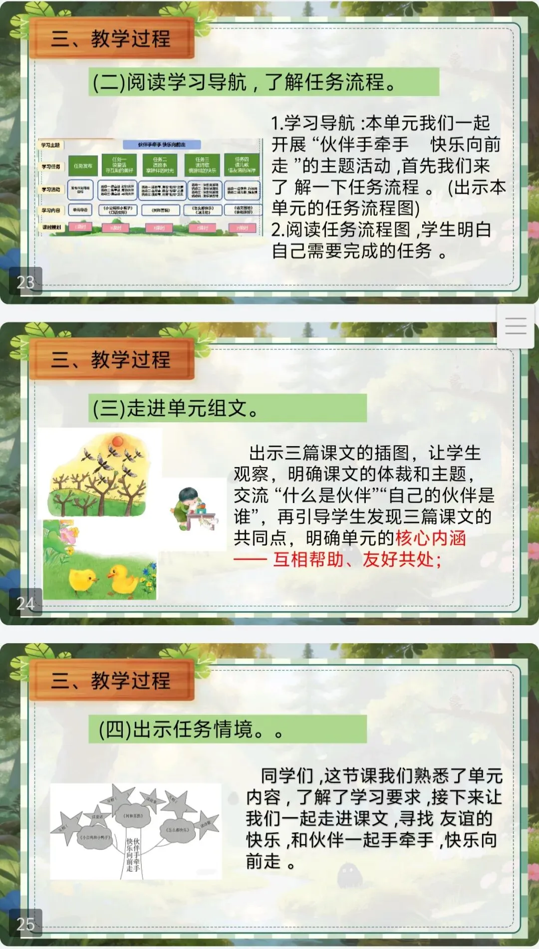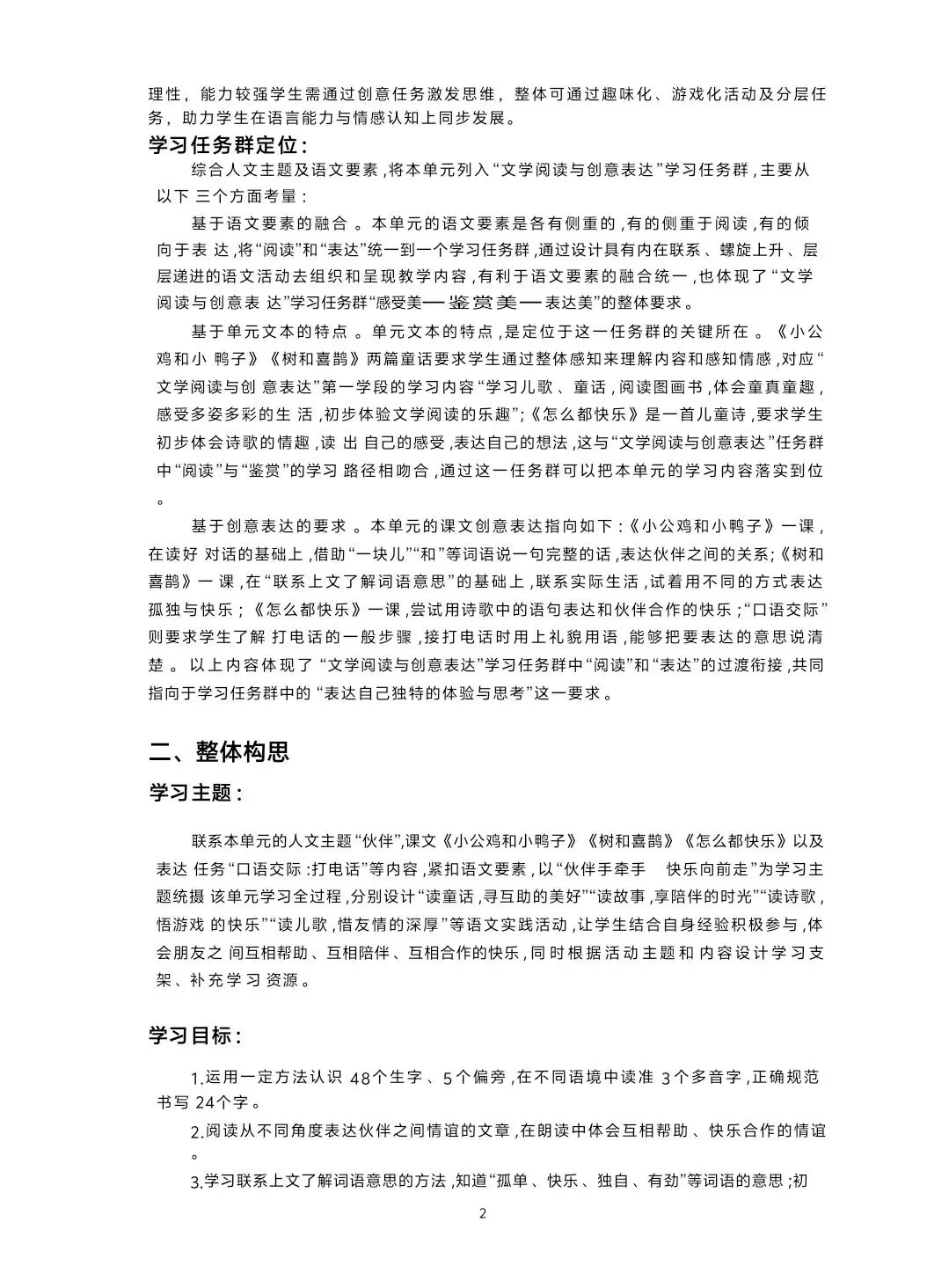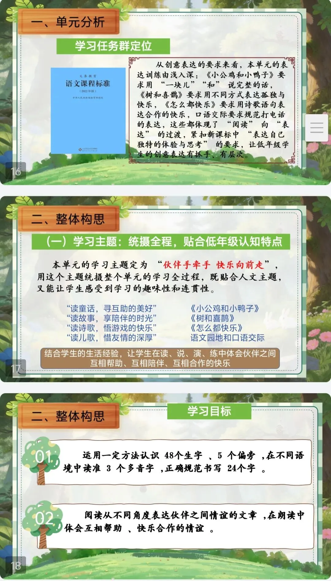 新课标强调语文教学要注重单元整体设计,避免碎片化教学,因此我们围绕 “伙伴” 这一核心,确定了统一的学习主题、学习目标和任务框架,让整个单元的教学形成一个有机整体。