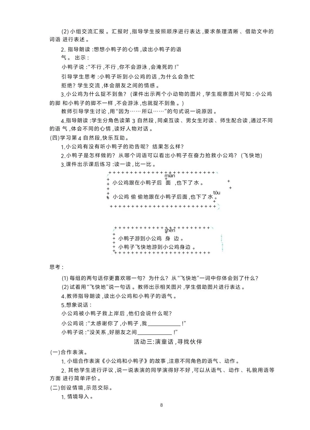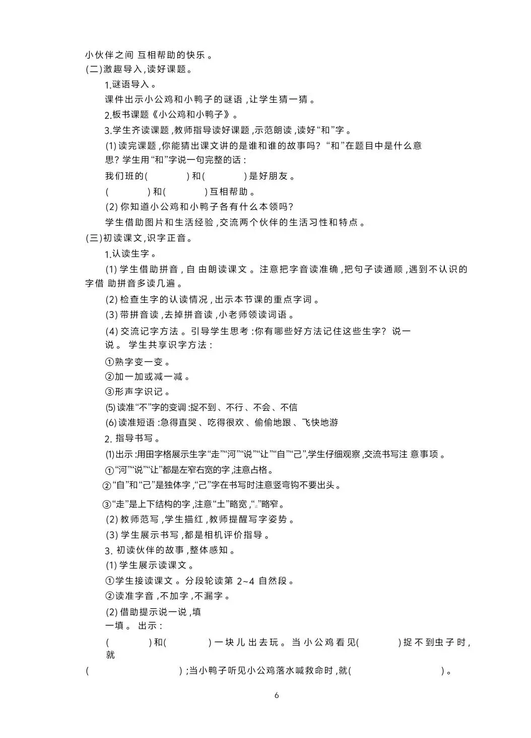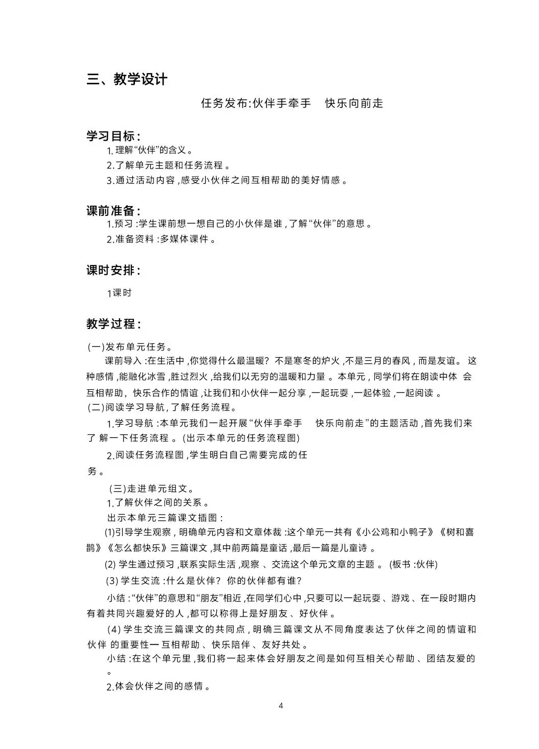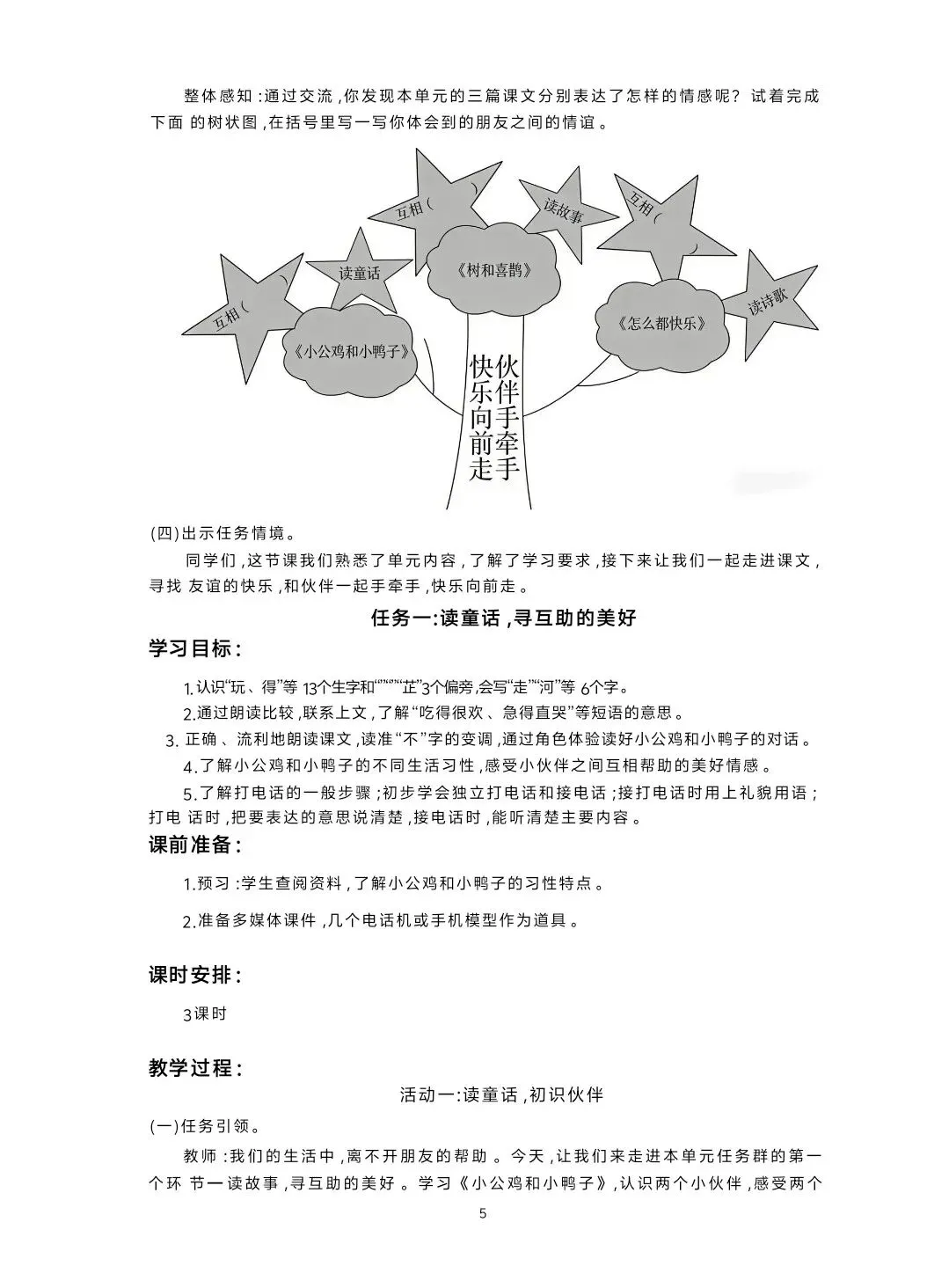本单元的学习主题定为 “伙伴手牵手 快乐向前走”,用这个主题统摄整个单元的学习全过程,既贴合人文主题,又能让学生感受到学习的趣味性和连贯性。围绕这个主题,我们设计了四个层层递进的语文实践活动:“读童话,寻互助的美好”(对应《小公鸡和小鸭子》)、“读故事,享陪伴的时光”(对应《树和喜