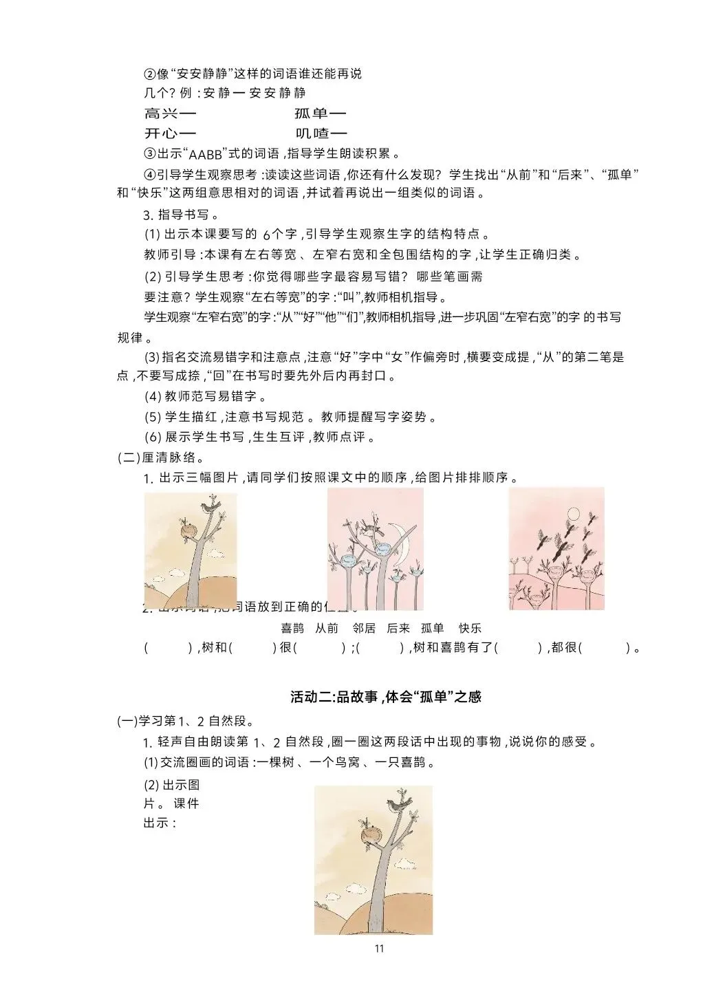最后,从创意表达的要求来看,本单元的表达训练由浅入深:《小公鸡和小鸭子》要求用 “一块儿”“和” 说完整的话,《树和喜鹊》要求用不同方式表达孤独与快乐,《怎么都快乐》要求用诗歌语句表达合作的快乐,口语交际要求规范打电话的表达,这些都体现了 “阅读” 向 “表达” 的过渡,紧扣新课标中 “表达自己独特的体验与思考” 的要求,让低年级学生的创意表达有抓手、有层次。