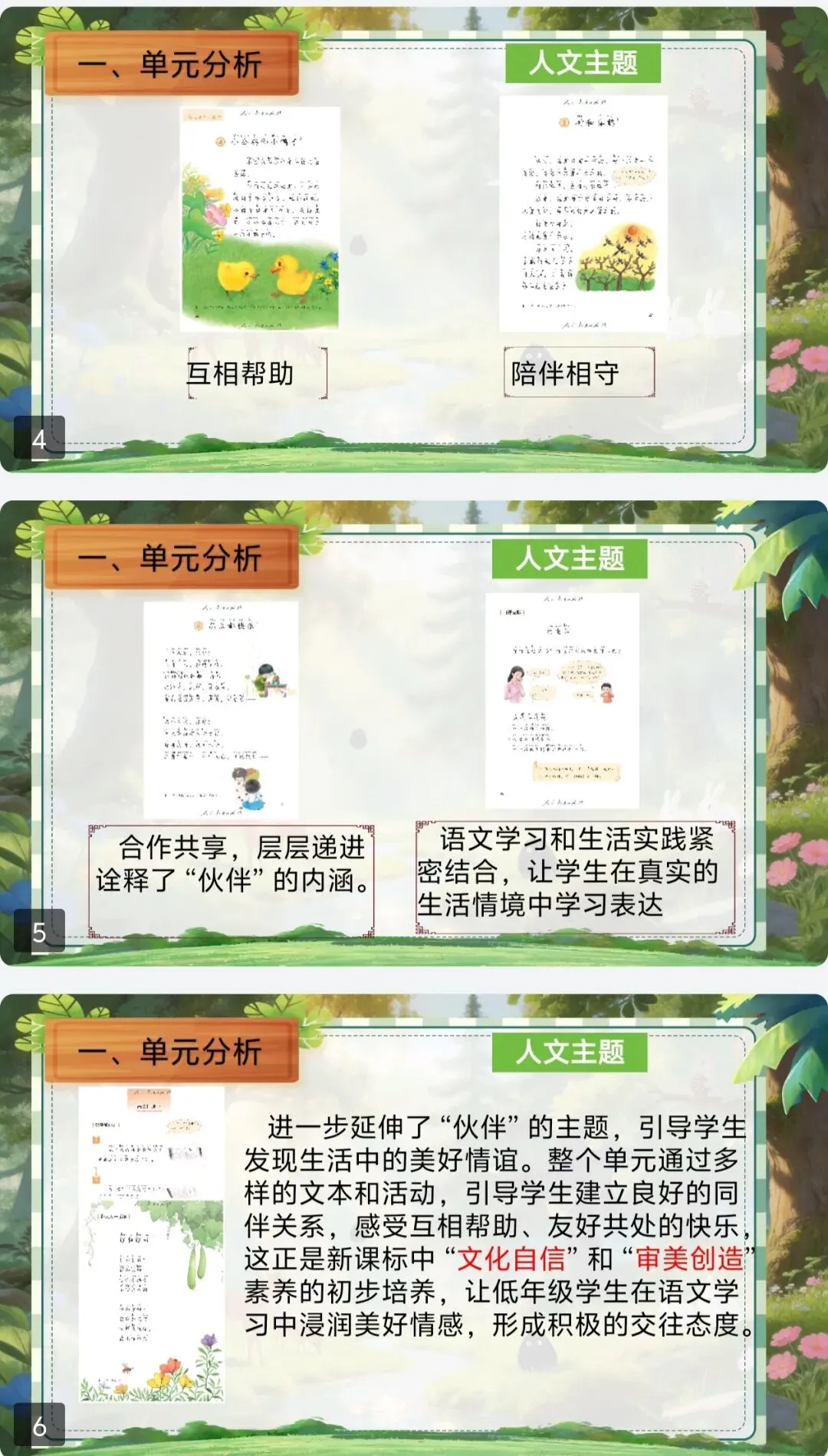 接下来,我将从单元分析、整体构思、教学设计、作业评价及教学建议五个方面,和大家详细交流本单元的教学思路与实施策略,力求让教学更具针对性、系统性和实效性,让低年级孩子在语文学习中感受伙伴情谊,提升语文素养。