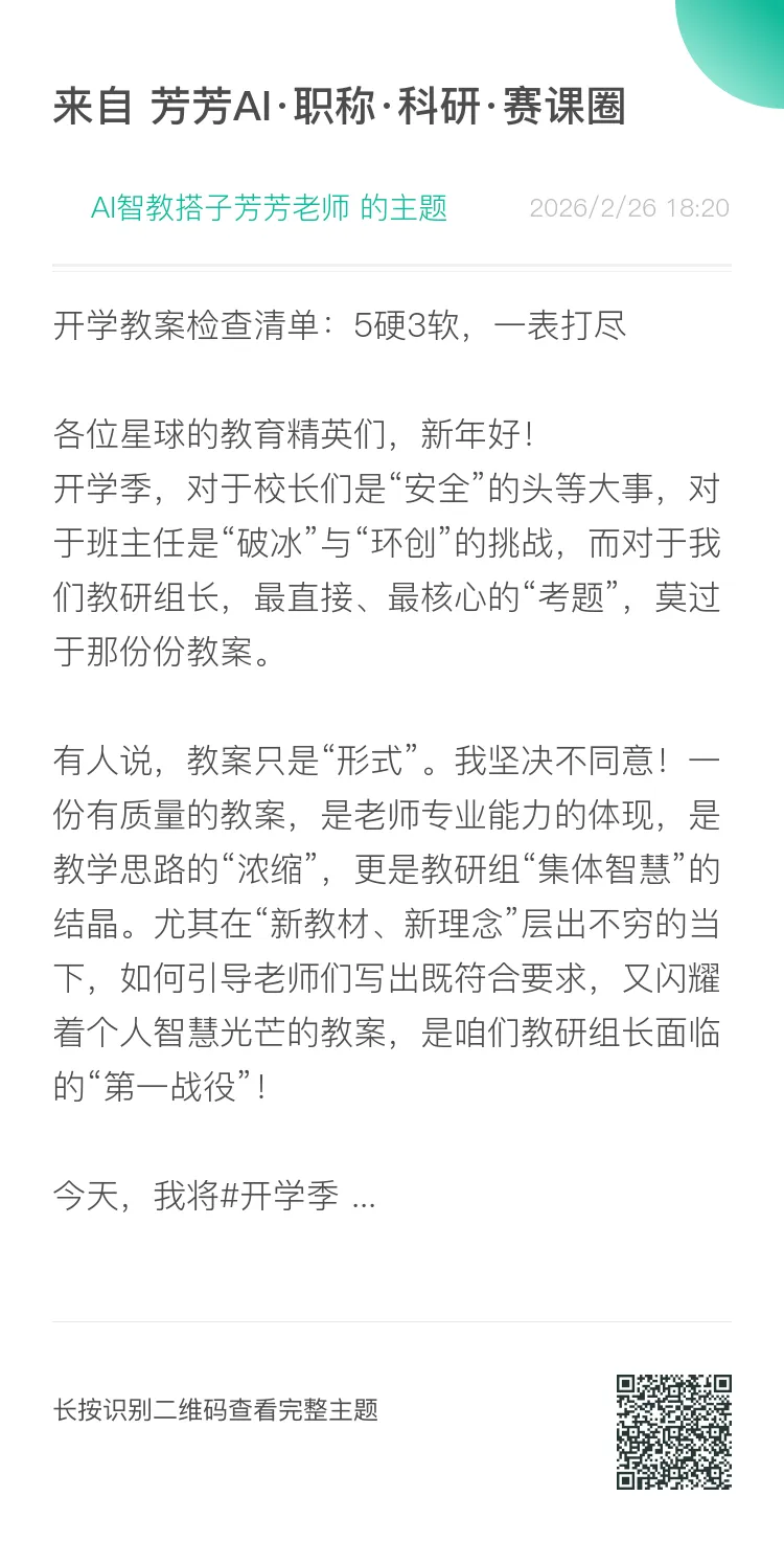 加入我的知识星球【芳芳AI·职称·科研·赛课圈】领取:《开学教案检查清单:5硬3软,一表打尽》