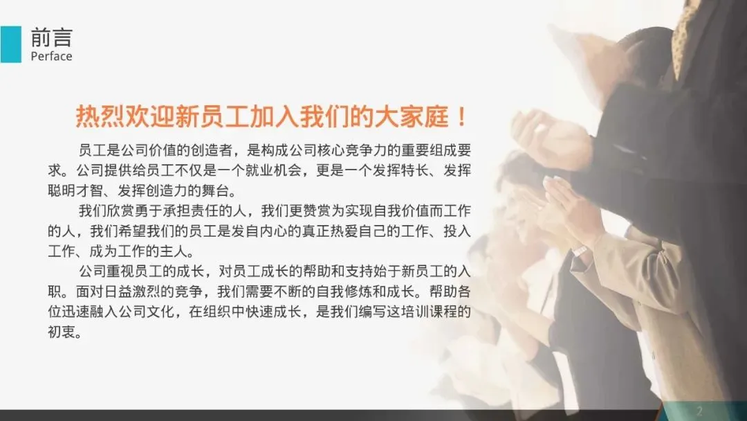 公司重视员工的成长,对员工成长的帮助和支持始于新员工的入职。面对日益激烈的竞争,我们需要不断地自我修炼和成长。帮助各位迅速融入公司文化,在组织中快速成长,是我们编写这培训课程的初衷。