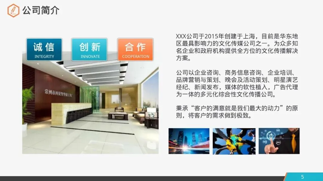 XXX公司于2015年创建于上海,目前是华东地区最具影响力的文化传媒公司之一。为众多知名企业和政府机构提供全方位的文化传播解决方案。