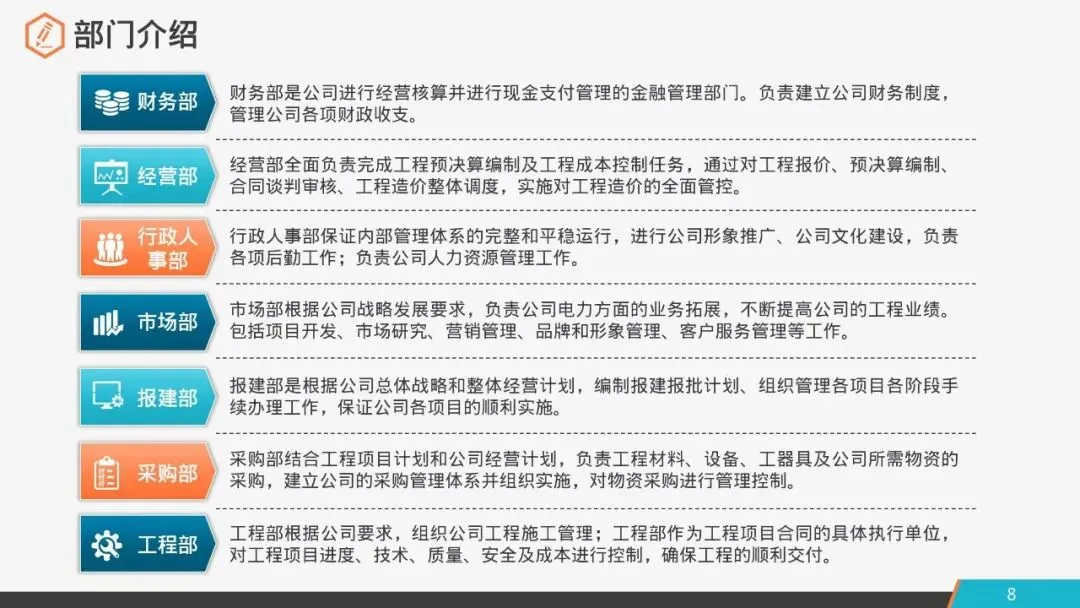 经营部:经营部全面负责完成工程预决算编制及工程成本控制任务,通过对工程报价、预决算编制、合同谈判审核、工程造价整体调度,实施对工程造价的全面管控。