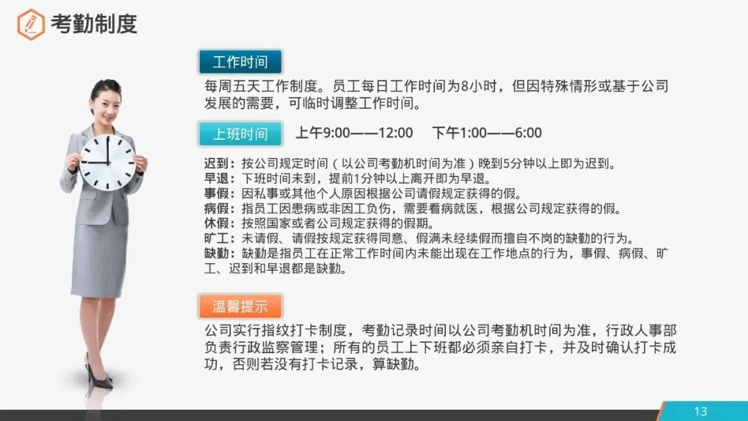 温馨提示:公司实行指纹打卡制度,考勤记录时间以公司考勤机时间为准,行政人事部负责行政监察管理;所有的员工上下班都必须亲自打卡,并及时确认打卡成功,否则若没有打卡记录,算缺勤。