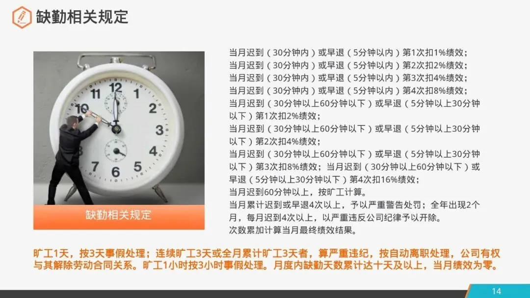 当月迟到(30分钟以上60分钟以下)或早退(5分钟以上30分钟以下)第3次扣8%绩效;当月迟到(30分钟以上60分钟以下)或早退(5分钟以上30分钟以下)第4次扣16%绩效;