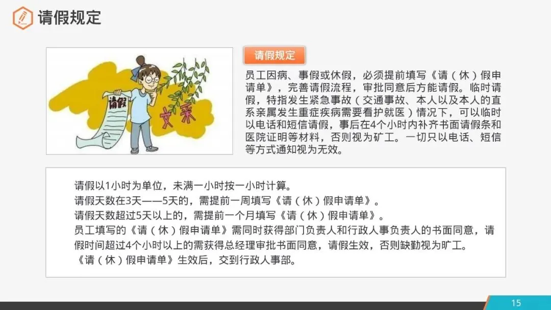 员工因病、事假或休假,必须提前填写《请(休)假申请单》,完善请假流程,审批同意后方能请假。临时请假,特指发生紧急事故(交通事故、本人以及本人的直系亲属发生重症疾病需要看护就医)情况下,可以临时以电话和短信请假,事后在4个小时内补齐书面请假条和医院证明等材料,否则视为矿工。一切只以电话、短信等方式通知视为无效。