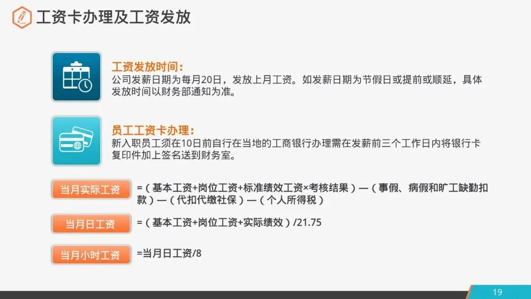 员工工资卡办理:新入职员工须在10日前自行在当地的工商银行办理需在发薪前三个工作日内将银行卡复印件加上签名送到财务室。