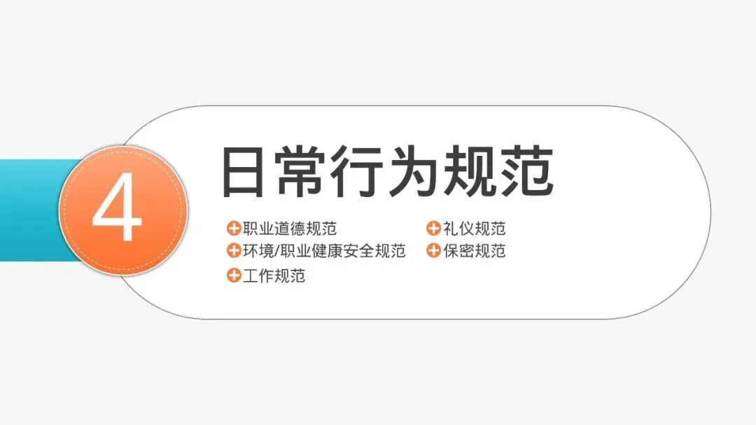 员工行为规范有五个方面:职业道德规范、礼仪规范、环境/职业健康安全规范、保密规范、工作规范。
